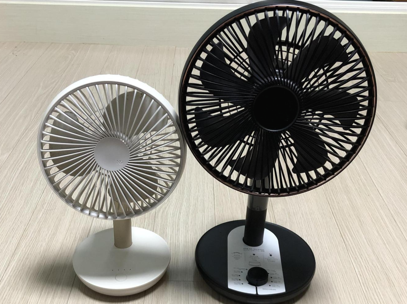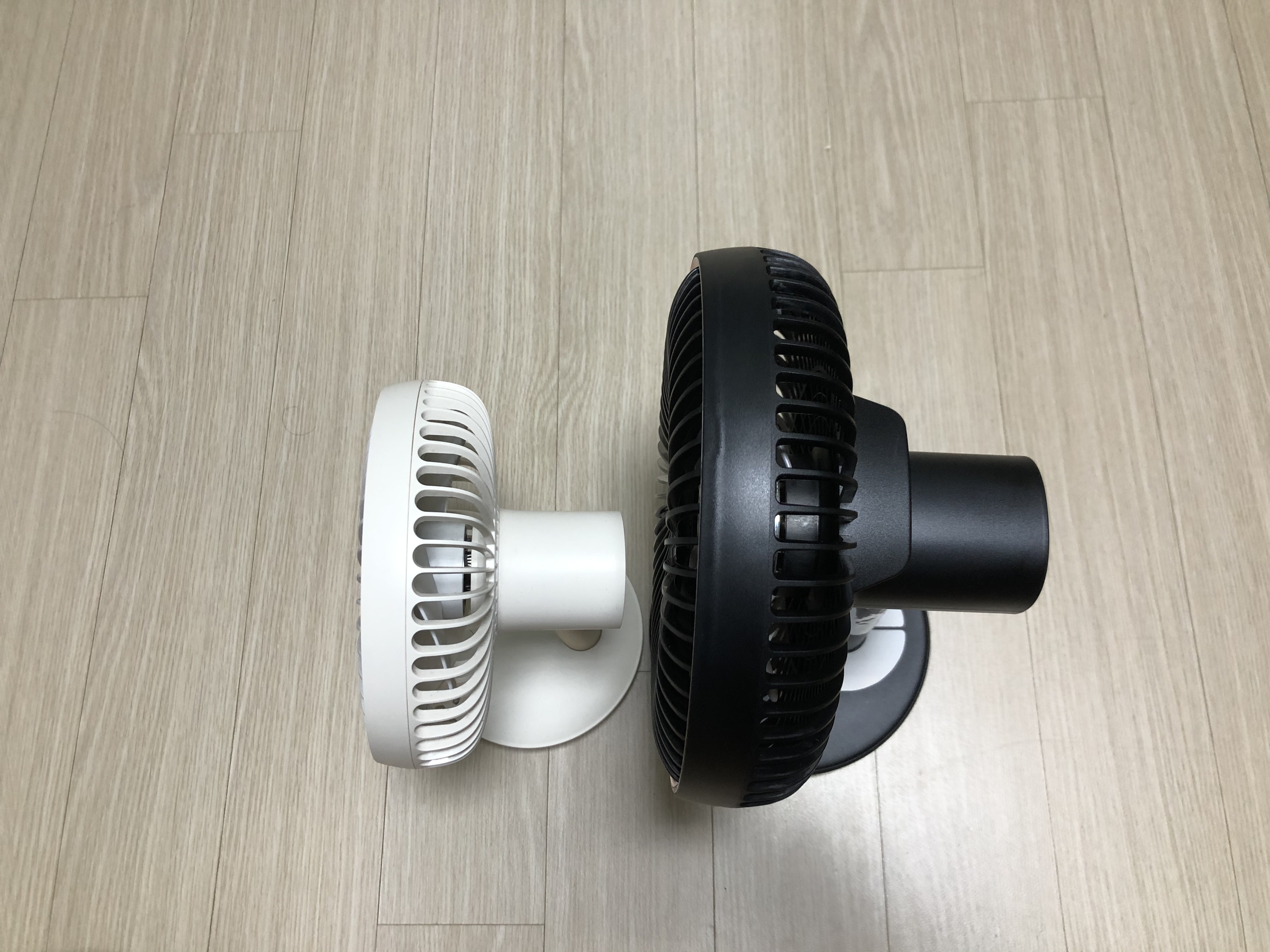 루메나 FAN STAND 2와 FAN PRIME 서큘레이터 크기 비교 사진이다. 왼쪽의 흰색 선풍기가 STAND 2, 오른쪽의 검은색 선풍기가 PRIME 서큘레이터이다.