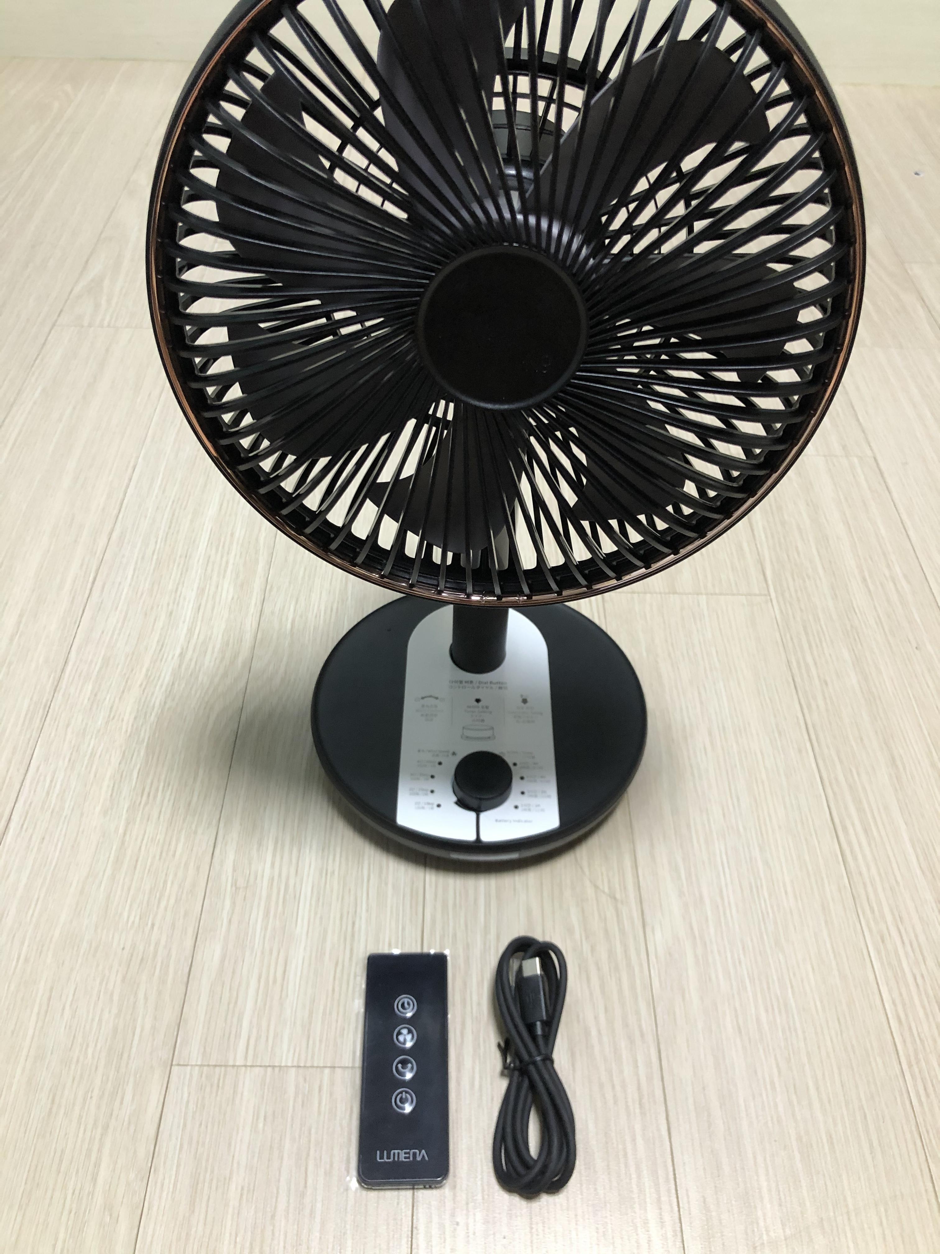 구성품은 위의 사진과 같다. 선풍기 본체, 리모컨, USB-C 케이블 세 가지이다. 아쉬운 점은 충전 어댑터가 없다는 것이다. 여분의 충전 어댑터가 없다면 따로 준비를 해야 한다.