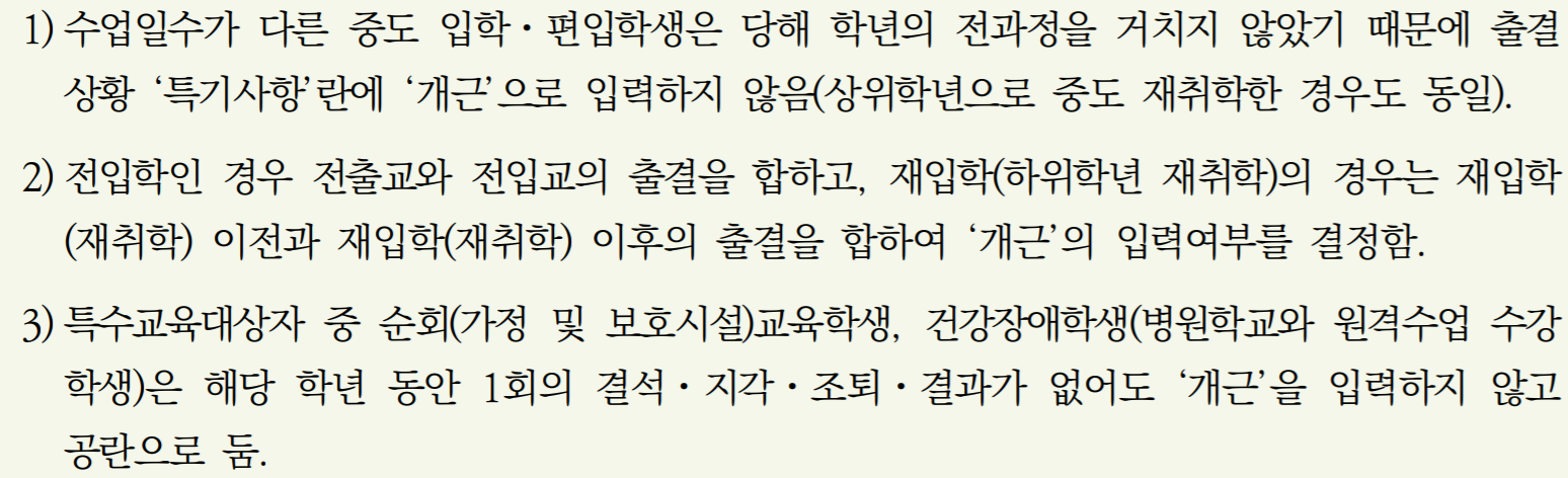 - 특수교육대상자 중 순회(가정 및 보호시설)교육학생, 건강장애학생(병원학교와 원격수업 수강학생)은 해당 학년 동안 1회의 결석, 지각, 조퇴, 결과가 없어도 '개근'을 입력하지 않고 공란으로 둔다.
