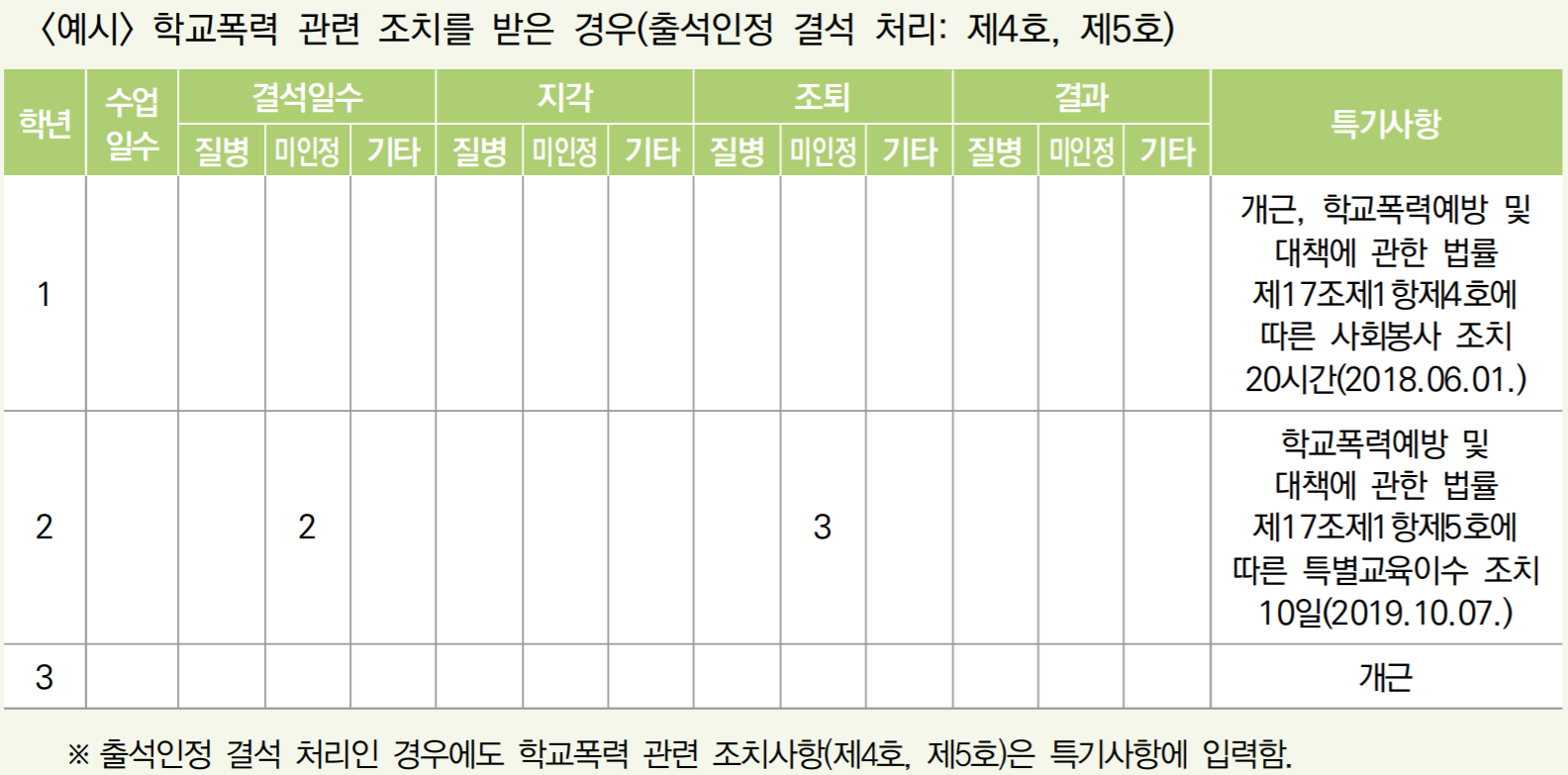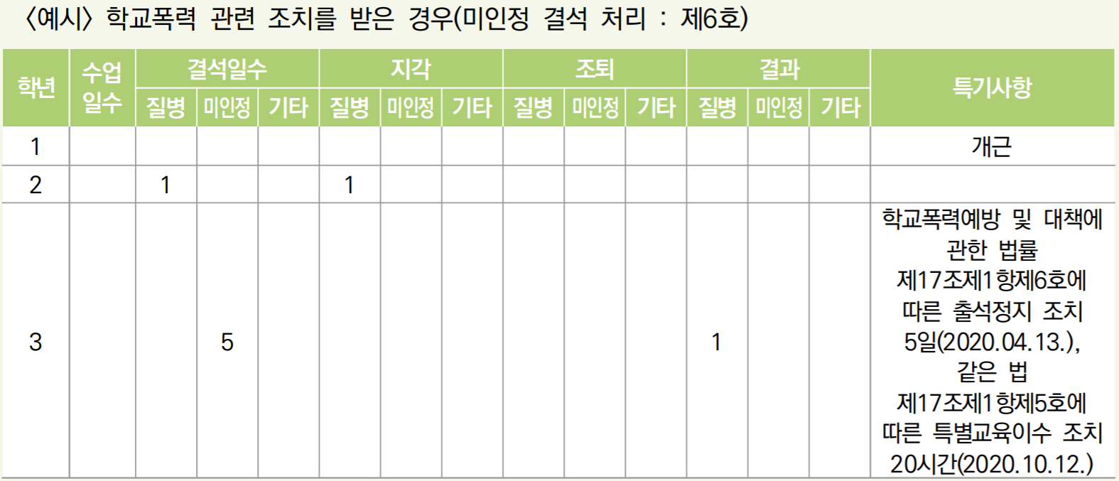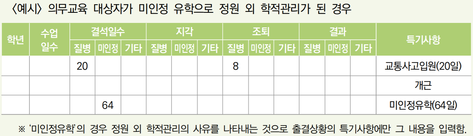 출석인정 결석은 출석으로 처리한다. 해당 학년 동안 1회의 결석, 지각, 조퇴, 결과도 없는 경우 출결상황 '특기사항'란에 '개근'으로 입력한다.