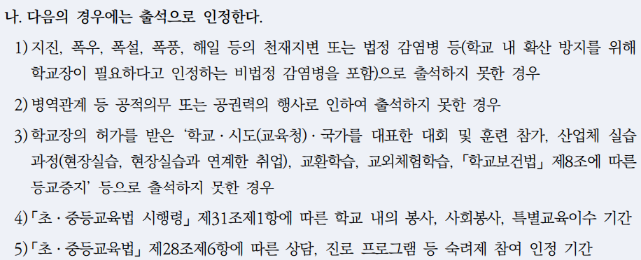 출석이 인정되는 경우는 다음과 같다. 천재지변 또는 법정 감염병 등으로 인한 결석, 병역관계 등 공적의무 또는 공권력의 행사로 인한 결석, 학교장의 허가를 받은 국가대표 대회 및 훈련 참가, 산업체 실습 과정 등으로 인한 결석, 학교 내의 봉사, 사회봉사, 특별교육이수 기간, 상담, 진로 프로그램 등 숙려제 참여 인정 기간이 출석 인정 범위이다.