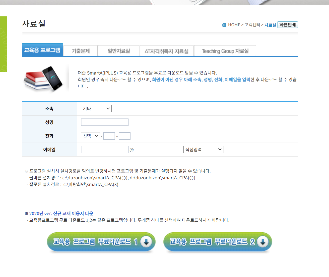 4. 인적사항을 모두 입력했으면 교육용 프로그램 다운로드 1, 2 중 하나 선택해 다운로드 받는다.