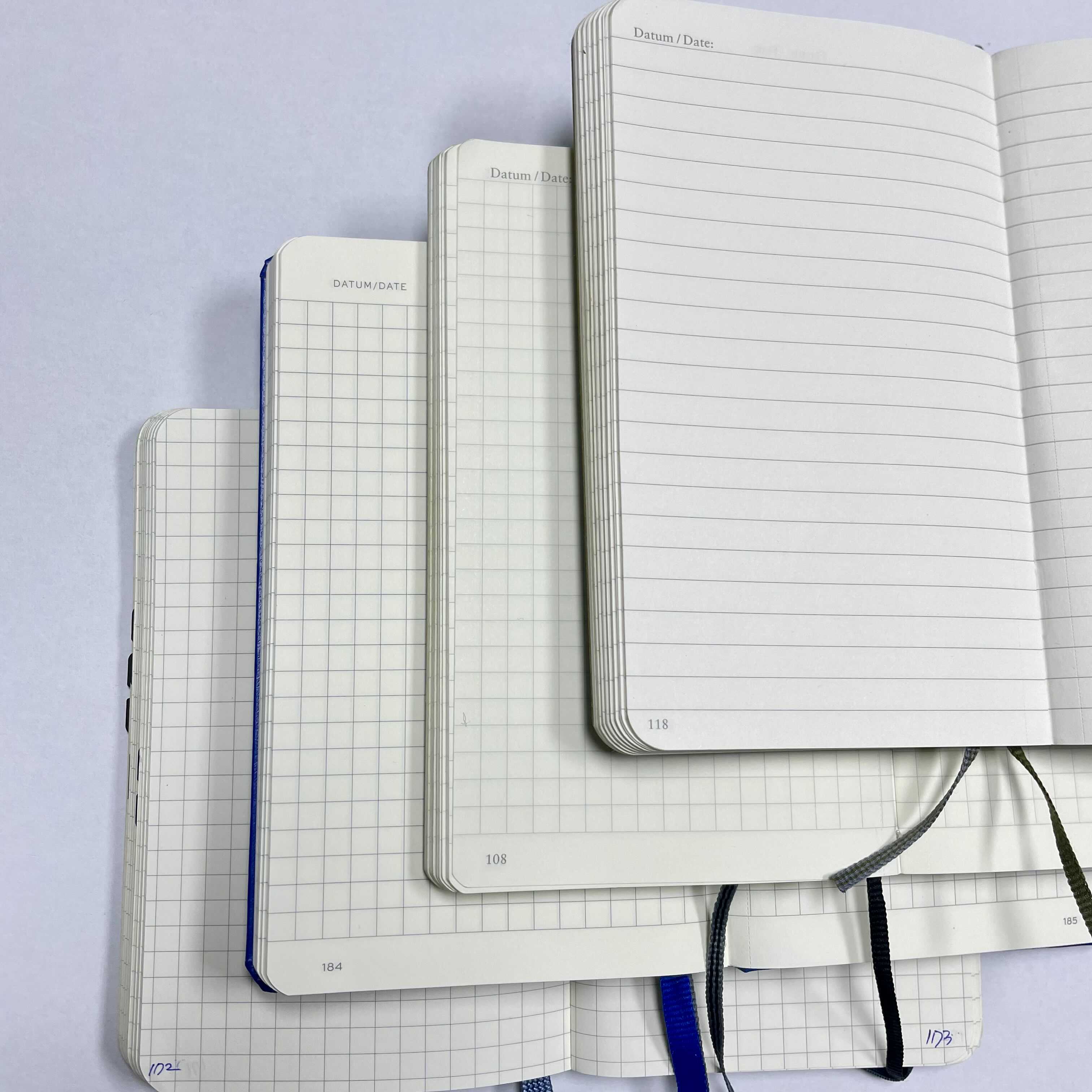 노트 내부. 제일 좌측이 몰스킨, 나머지는 로이텀이다. 몰스킨은 페이지 번호가 매겨져 있지 않아 내가 직접 매겼다. 나머지 로이텀 노트는 페이지 번호가 매겨져있는 것을 확인할 수 있다.