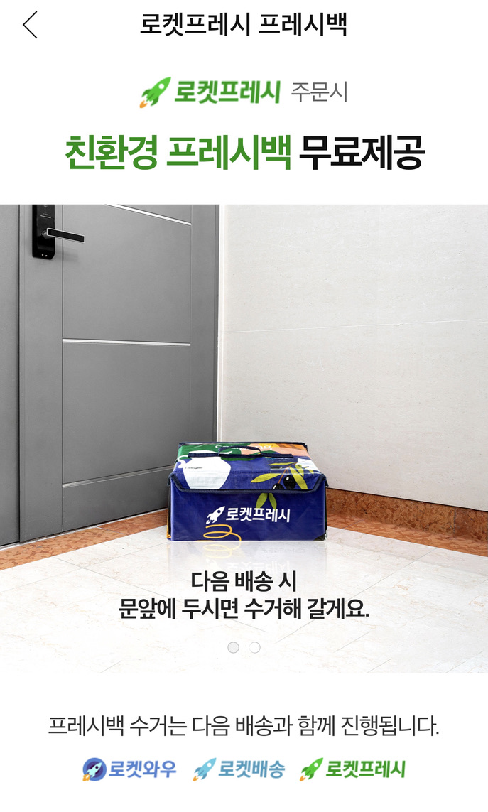출퇴근을 하다 보면 옆집 문 앞에 로켓프레시백으로 물건이 배송되어 있는 것을 볼 수 있다. 처음에는 쿠팡이 써있길래 새로운 디자인의 박스인가 싶었다. 그러나 알고 보니 냉동, 냉장 식품을 배송받을 때 선택할 수 있는 포장 옵션이었다. 최근 쿠팡에서 냉동식품을 구입을 하게 되었다. 그동안 박스 포장으로만 물건을 받다가 프레시백 옵션을 선택해 물품을 수령했다.