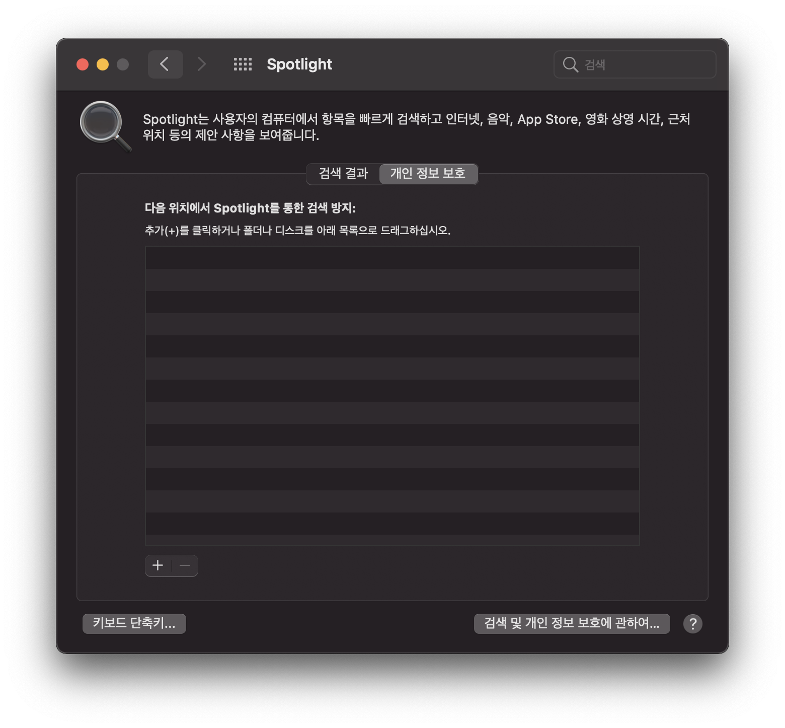 카테고리 지정 해제 외에도 검색 방지 폴더를 지정할 수 있다. 특정한 폴더 내의 내용은 검색에서 제외시킬 수 있다. '+' 버튼을 이용해 폴더를 찾아 지정해주면 된다.