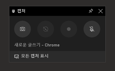 Win + G키는 게임 바를 여는 키이다. 아래와 같은 <캡처> 창에서 맨 왼쪽의 사진기 버튼으로 스크린샷 캡처를 할 수 있다. 캡처 시에는 활성화 되어있는 창만 캡처가 된다. 다시 말하면 Win + G를 누르기 직전에 켜져있던 창만 캡처된다.