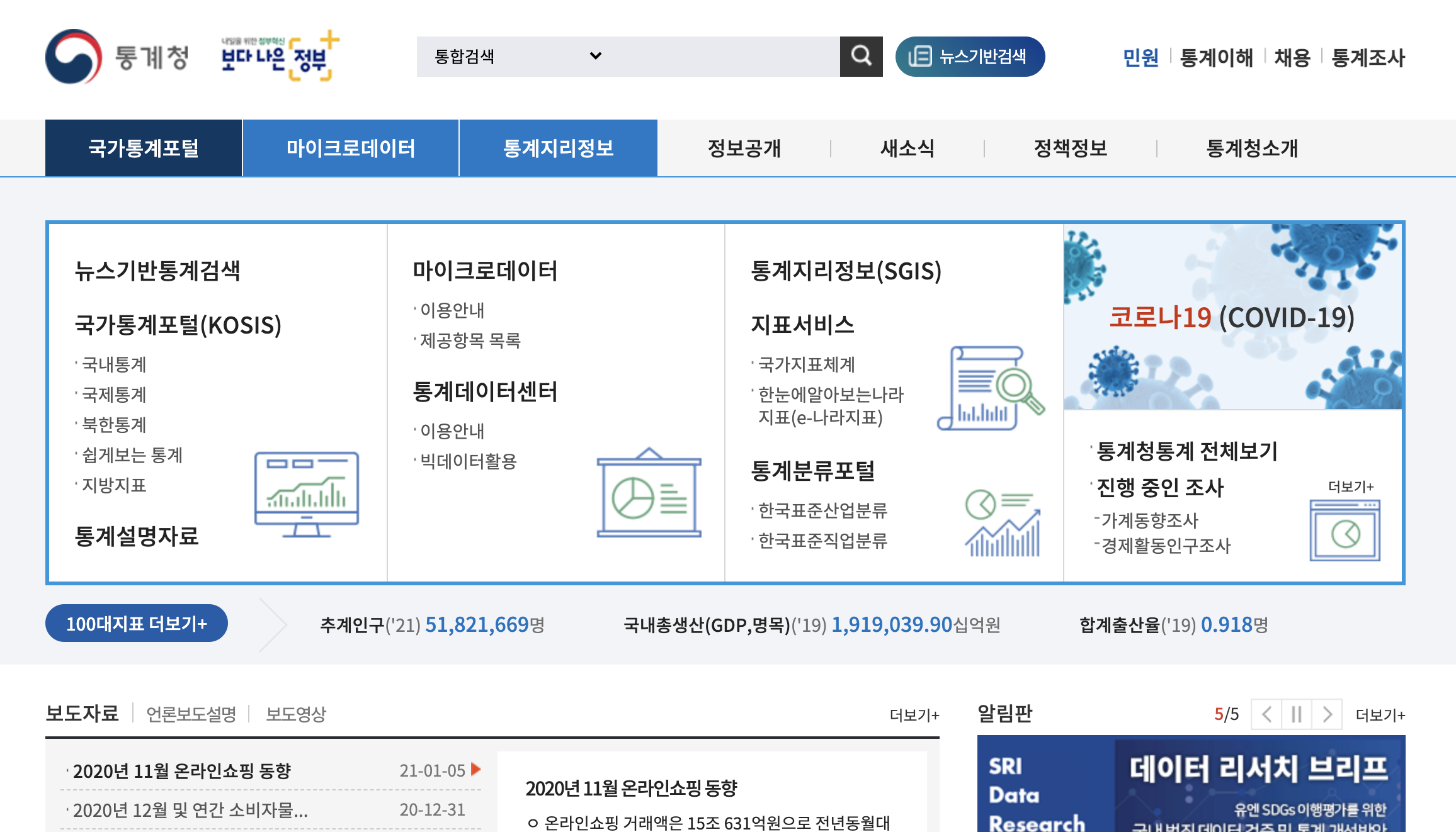 통계청 홈페이지에 접속하면 다음과 같은 화면을 볼 수 있다.