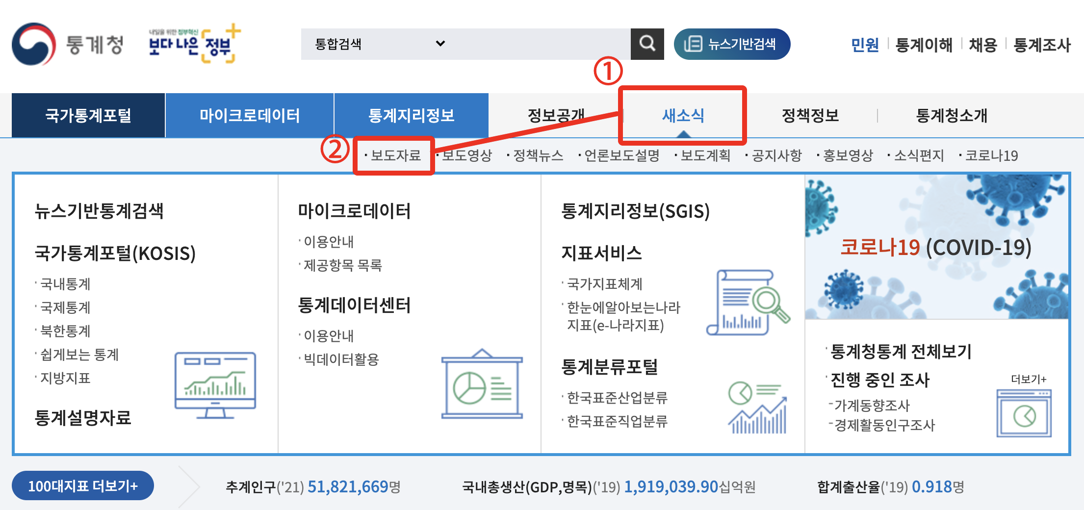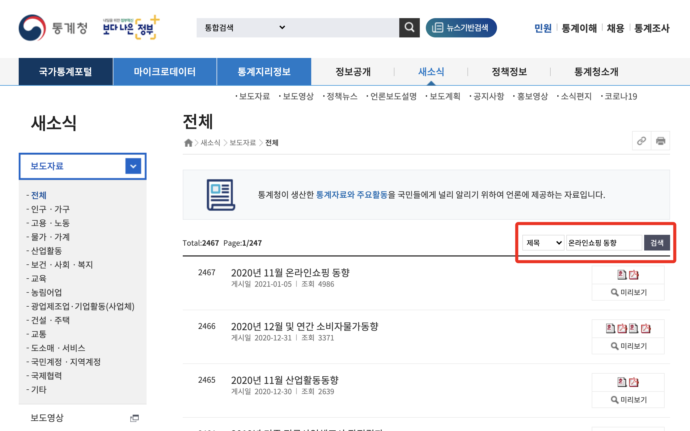 중간쯤에 있는 새소식 - 보도자료를 클릭해 게시판에 들어간다.