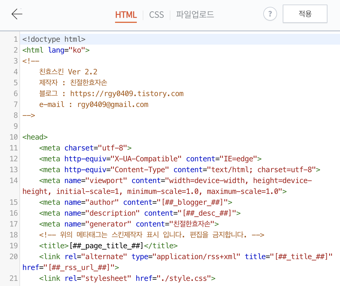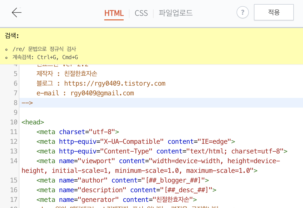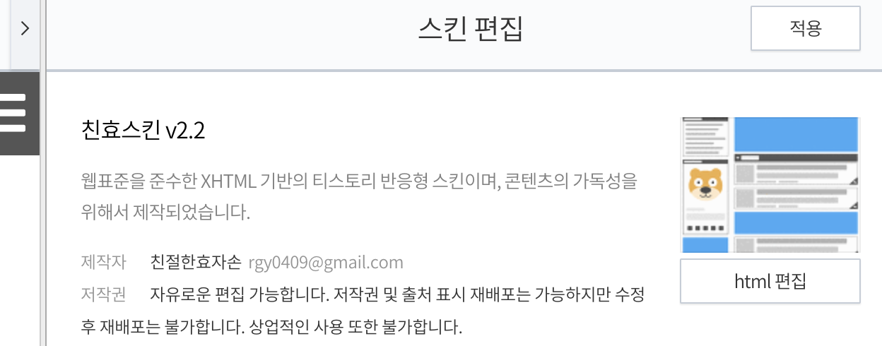 스킨 편집 창에서 우측 상단을 보면 <html 편집>이라는 버튼이 보일 것이다. <html 편집> 버튼을 클릭해준다.