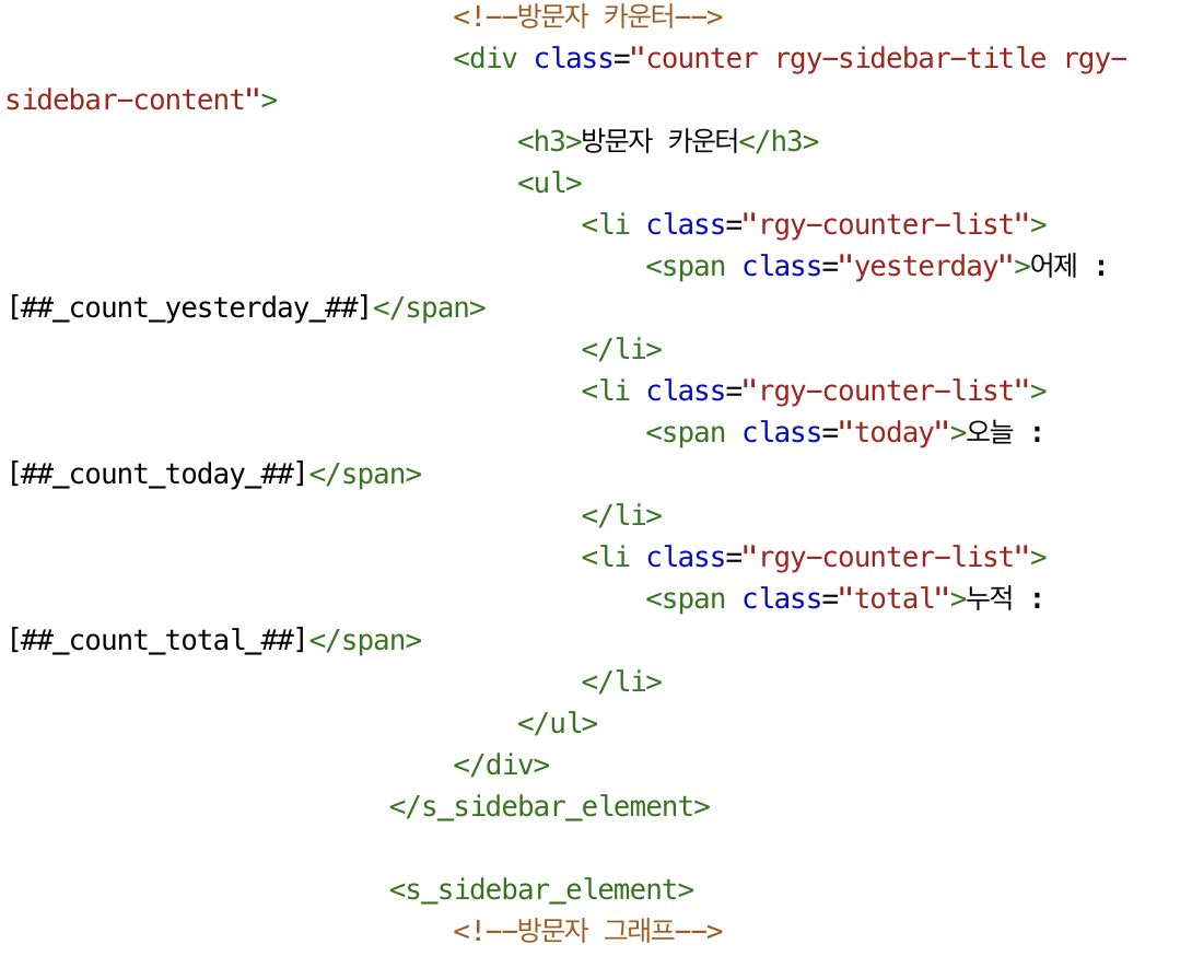 주석은 영어로 Comment이다. HTML 코드에서 코멘트를 넣는다는 것은 HTML 프로그램에는 영향을 미치지 않는 메모를 한다는 것이다. 아래 사진에서는 '방문자 카운터', '방문자 그래프'라는 문구가 두 개씩 보이는 것을 알 수 있다.