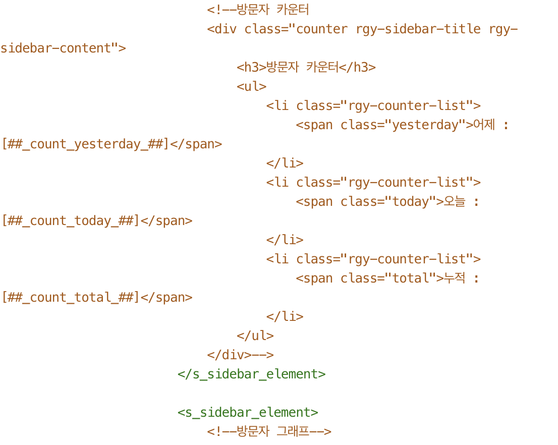 방문자 카운터 주석이 시작하는 부분부터 살펴보면 <div>태그로 코드가 시작되는 것을 알 수 있다. 따라서 div태그가 닫히는 부분까지 주석처리를 해주면 사이드바 상에서 방문자 카운터가 없어질 것으로 추측하고 한번 실행해보면 된다.