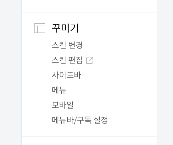 블로그 관리자 페이지의 왼쪽 사이드바에 꾸미기 - <스킨 편집> 항목이 있다. 스킨 편집을 클릭하면 새 창이 나타난다.