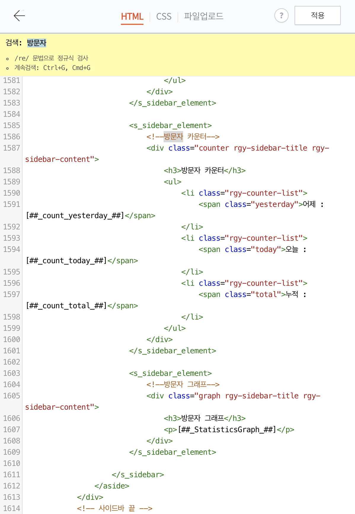 검색 창에 <방문자>를 검색하면 아래와 같은 결과가 나타난다. 사이드바 부분의 방문자 카운터, 방문자 그래프 전체 부분을 주석처리 해주면 사이드바 상에서는 해당 항목이 사라진다. 다시 나타나게 하고 싶을 때를 대비해 주석 처리만 해 줄 것이다.