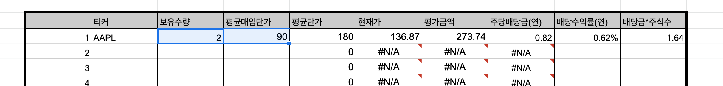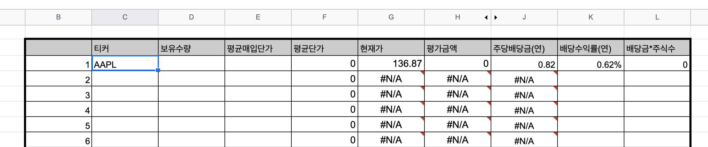 애플의 티커 심볼은 AAPL 입니다. 티커 열에 AAPL을 입력합니다.