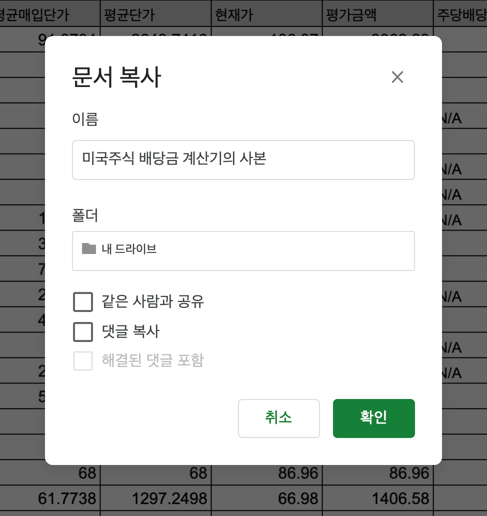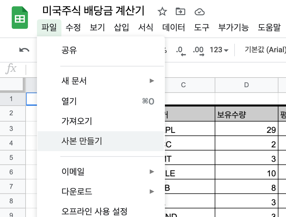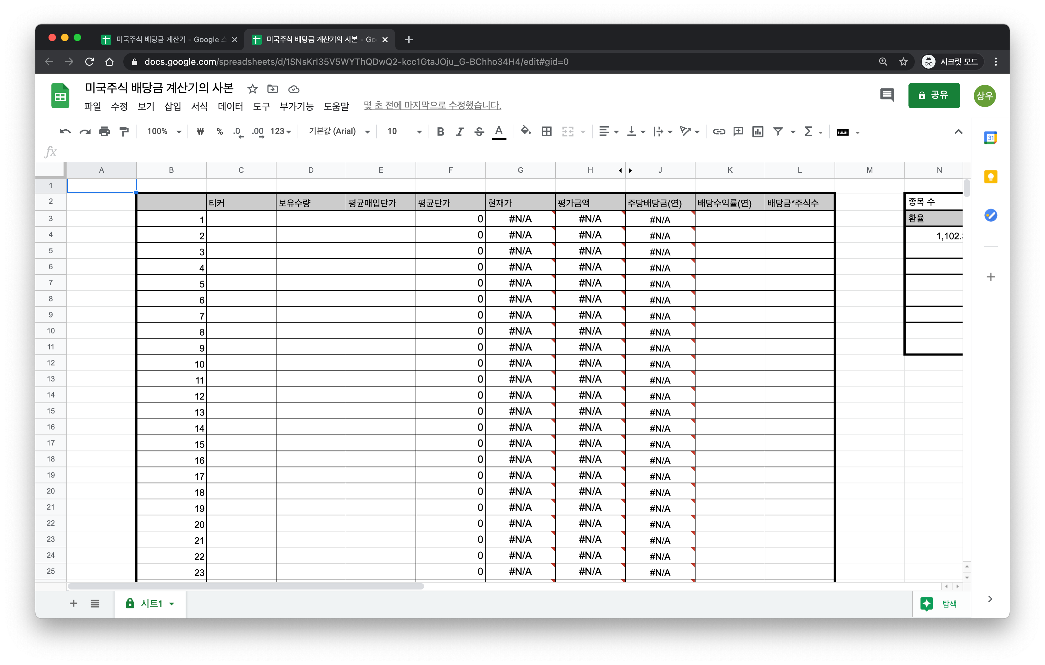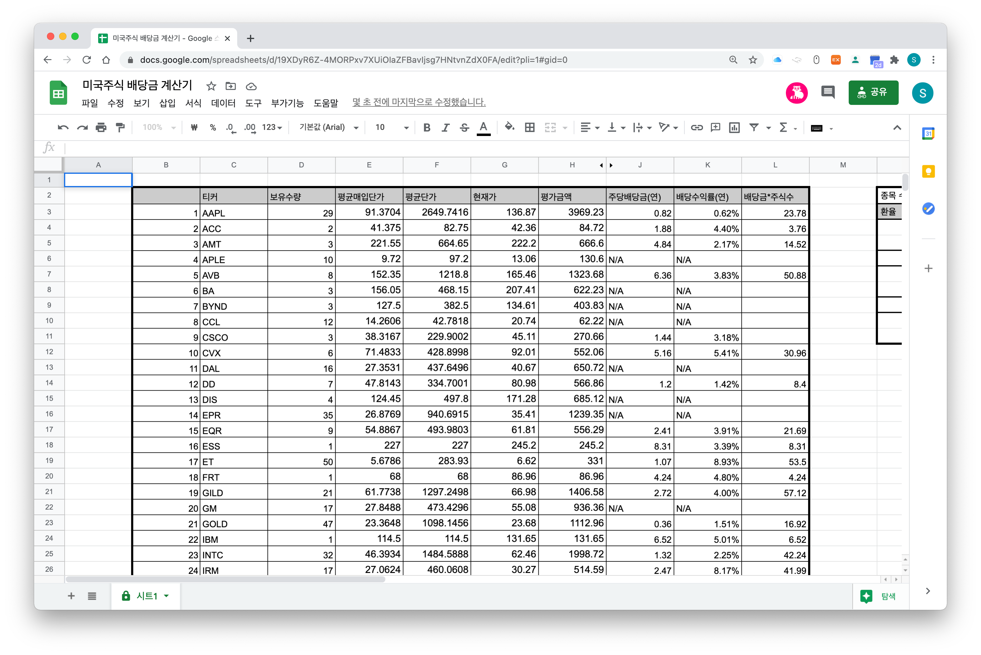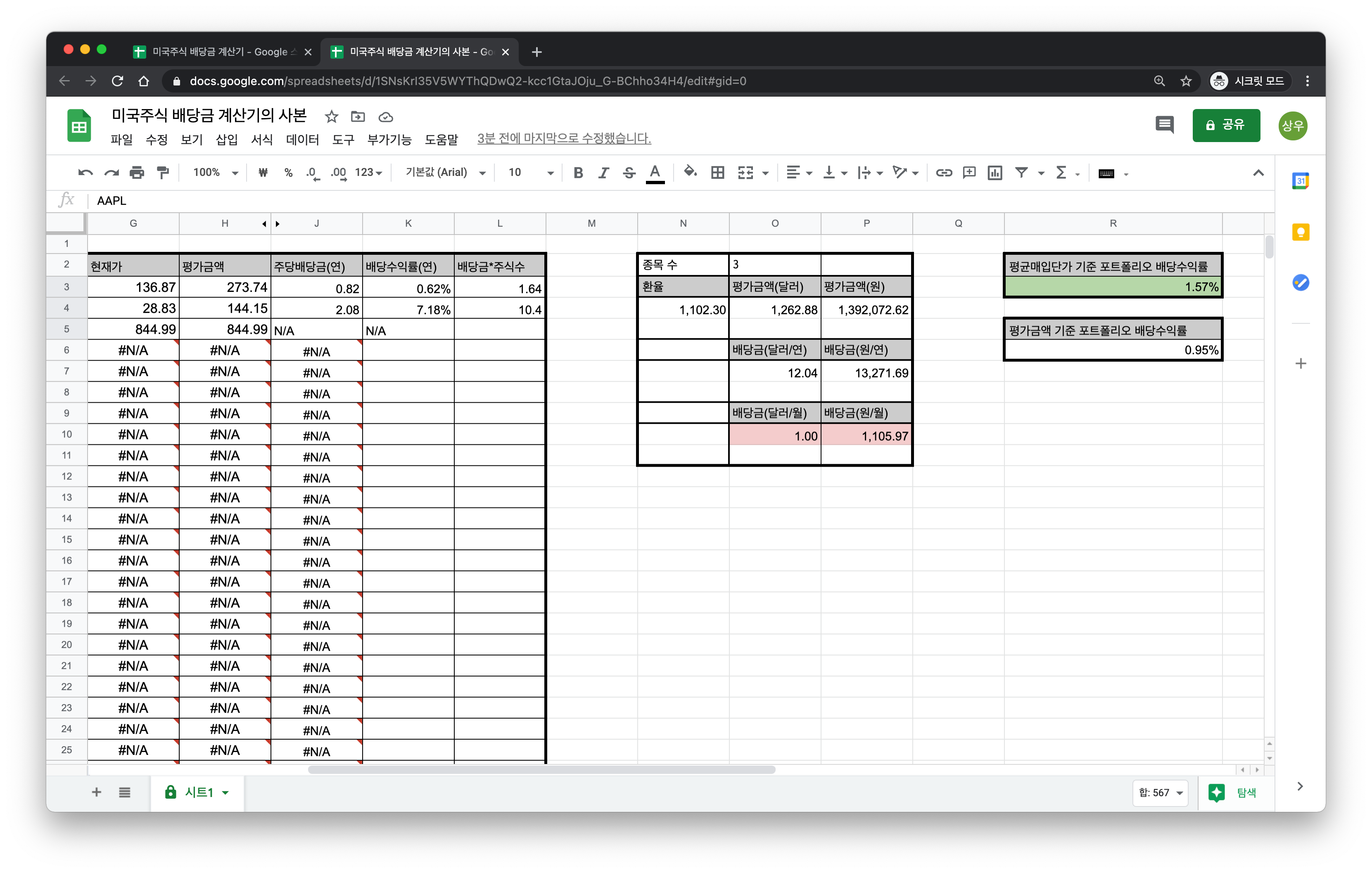 아래 링크에 접속해 배당금 계산기 파일에 접근합니다. 원본 유지를 위해 시트 보호를 해두었습니다. 수정하는 방법은 링크 아래에 설명하도록 하겠습니다.
