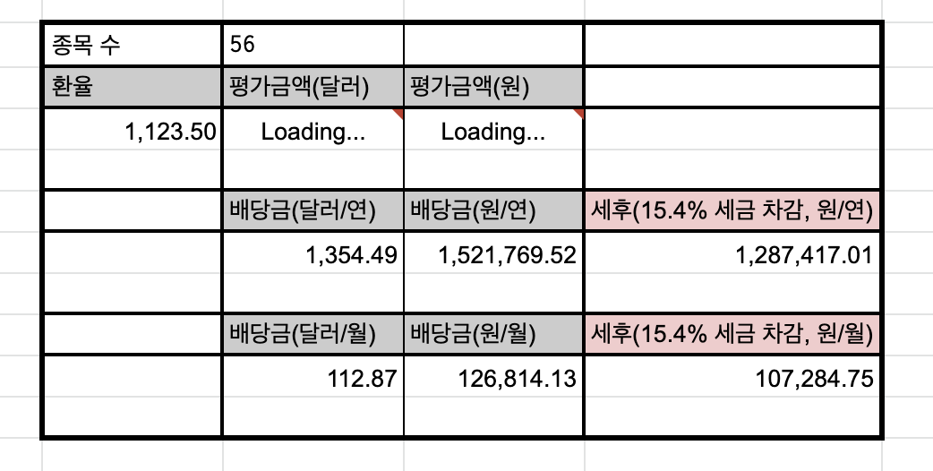 그 후 보유수량, 평균매입단가(달러)를 입력하시면 됩니다. 그러면 자동으로 현재가, 평가금액(현재가 x 보유수량), 주당배당금, 배당수익률, 총 배당금이 계산됩니다. 평균매입단가는 입력하지 않으셔도 무방하나, 매입금액 대비 배당수익률을 계산할 때는 입력이 필요합니다. 평가금액 대비 배당수익률은 의미가 없다고 생각합니다.
