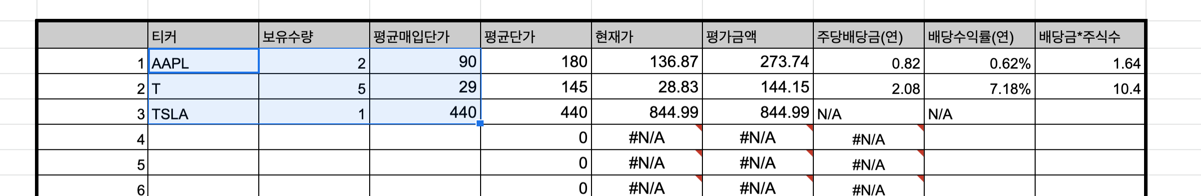 미국주식 배당금 계산기를 엑셀 파일(구글 스프레드시트)로 만들었습니다. 자신의 보유종목을 입력하면 자동으로 배당금과 배당수익률이 얼마인지 실시간으로 계산되도록 했습니다. 또한 총 매입금액/평가금액, 배당금을 이용해 배당수익률을 계산하는 기능까지 있습니다. 배당수익률은 야후 파이낸스에서 자동으로 다운로드되어 계산됩니다.
