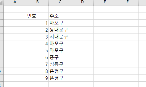 이 데이터들을 순서대로 정렬해서 보려면 아래와 같이 하면 된다. <번호>, <주소>에 블록을 씌운 뒤 <데이터> 리본 메뉴의 <필터>를 클릭한다.