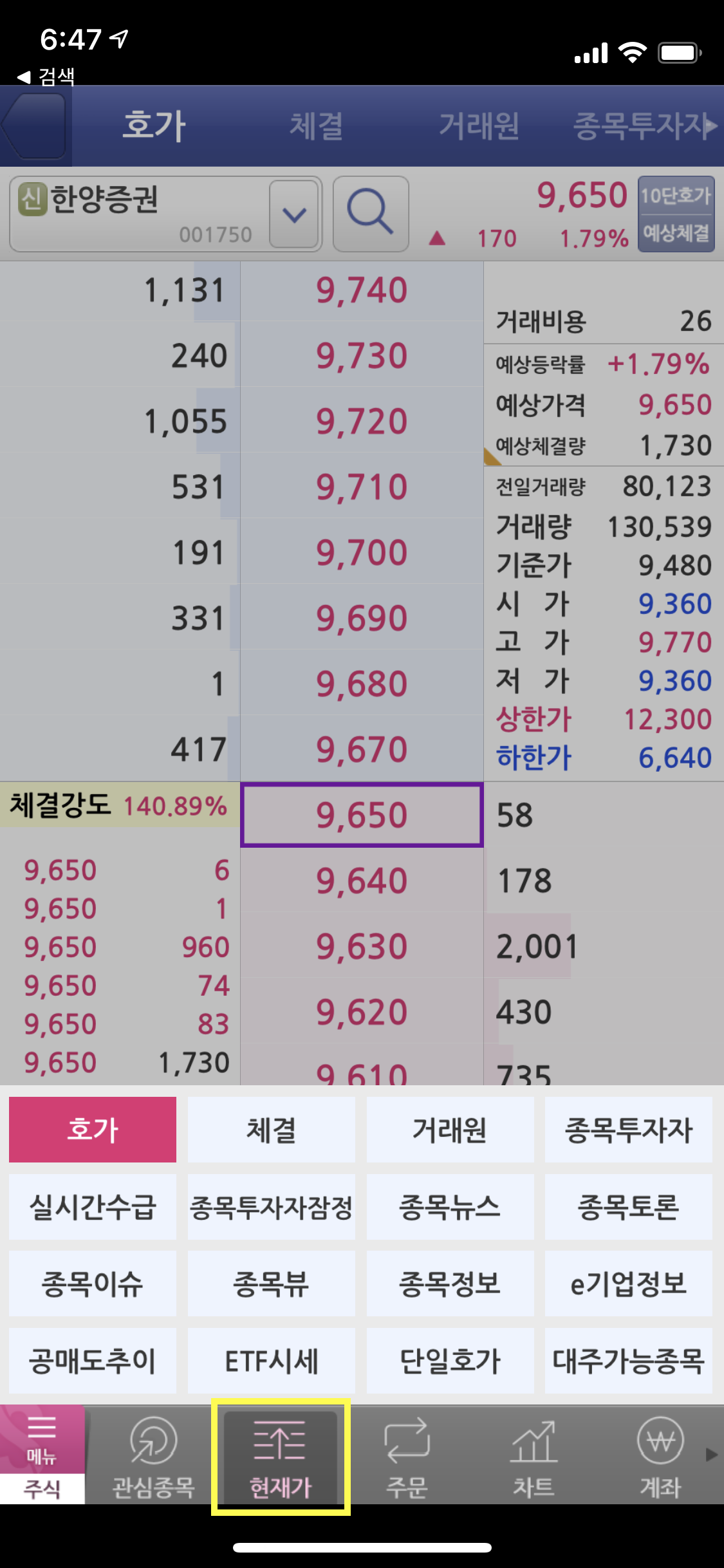 호가창이 나타나는데, <현재가> 버튼을 한 번 더 누른다. 그러면 여러 개의 메뉴가 나오는 것을 확인할 수 있다. 그 중 오른쪽 세 번째에 있는 <e기업정보>를 터치한다.
