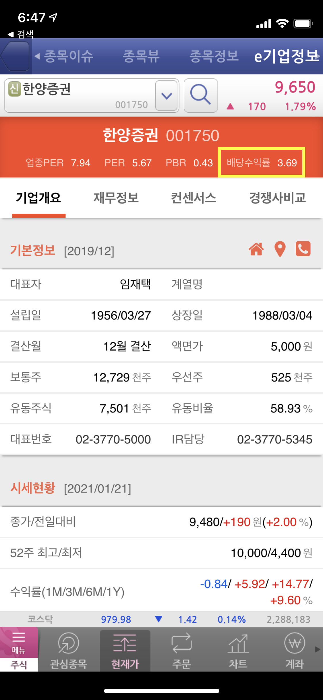 두번째, 우선주의 배당수익률은 확인할 수가 없다. 한양증권 종목의 경우 한양증권 본주와 한양증권우 우선주가 있다. 한양증권우의 <e기업정보>를 확인하더라도 한양증권의 종목정보가 나온다. 따라서 우선주 배당이 얼마나 되는지를 확인하기 위해서는 전자공시시스템에 접속해 정확하게 확인을 해야한다.