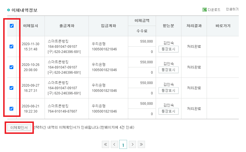 그러면 아래와 같이 이체 내역을 조회할 수 있다. 이체 내역이 맞는지 확인하고 출력하고자 하는 항목을 체크한다. 그리고 나서 왼쪽 하단의 <이체확인서> 버튼을 클릭한다.