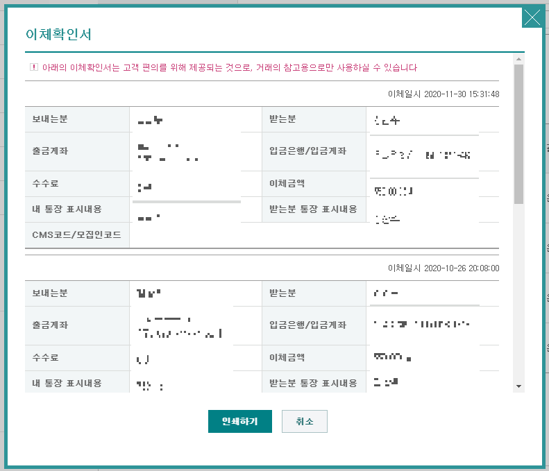 선택한 내역의 이체확인서가 화면에 나타난다. <인쇄하기> 버튼을 클릭해 인쇄를 한다. 출력되는 인쇄물을 월세 납입 증빙 서류로 사용할 수 있게 된다.