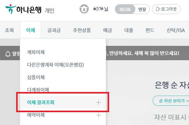 로그인을 한 뒤 왼쪽 위의 <이체> - <이체 결과조회>를 클릭한다.