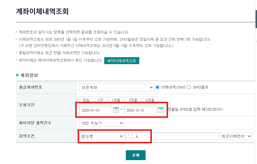 계좌이체내역을 조회할 수 있는 화면이 나타난다. 연말정산 기준일은 1월 1일부터 12월 31일까지이므로 기간을 이에 맞게 선택한다. 아래의 검색 조건에 <받는분>을 선택하고 월세를 수령한 임대인의 성명을 넣어 <조회>를 클릭한다. 다른 방법으로 조회하고자 하면 <받는분> 외에 다른 항목으로 조회할 수 있다.