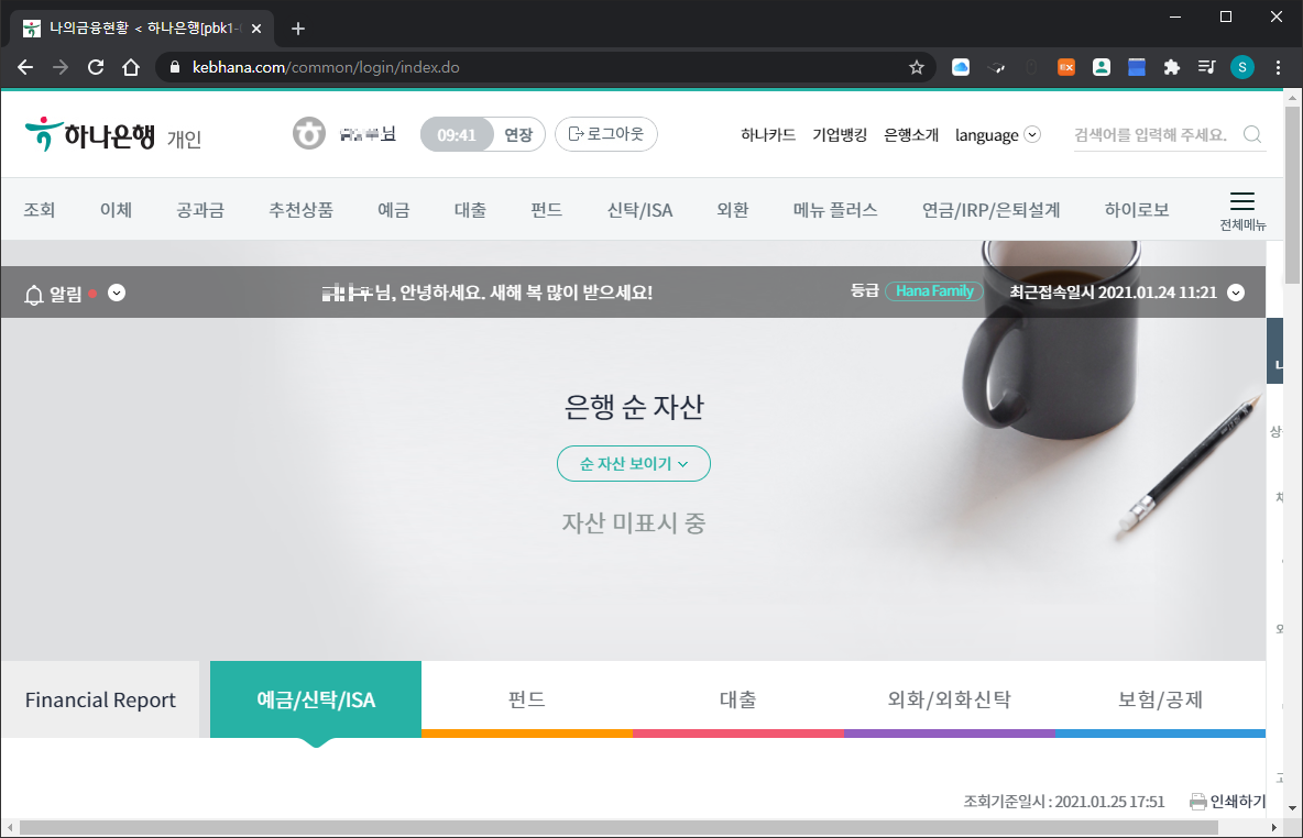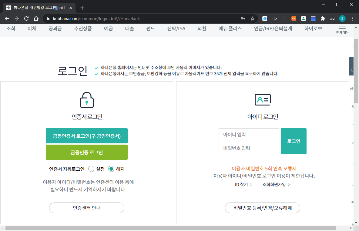 하나은행 홈페이지에 접속해 로그인을 먼저 한다.
