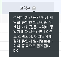 고객 수에 대한 설명을 읽어보면 설정한 기간동안 채널로 유입한 인원을 집계한 수라고 한다. 만약 A라는 고객이 일정 기간 동안 5번 방문했다고 가정했을 때, 이 기간 동안의 고객 수는 1이 된다.