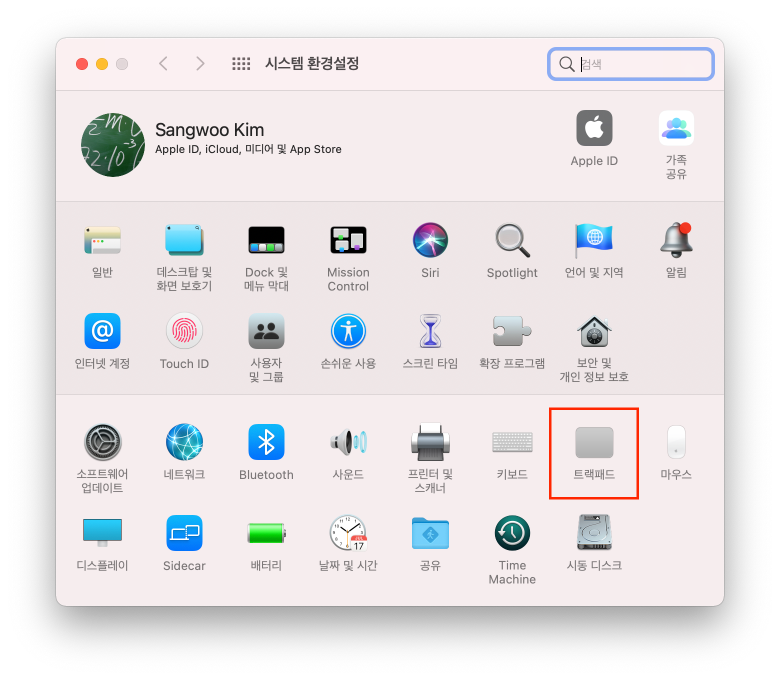 먼저 시스템 환경설정 창을 연다. 창이 열리면 <트랙패드>를 선택한다.