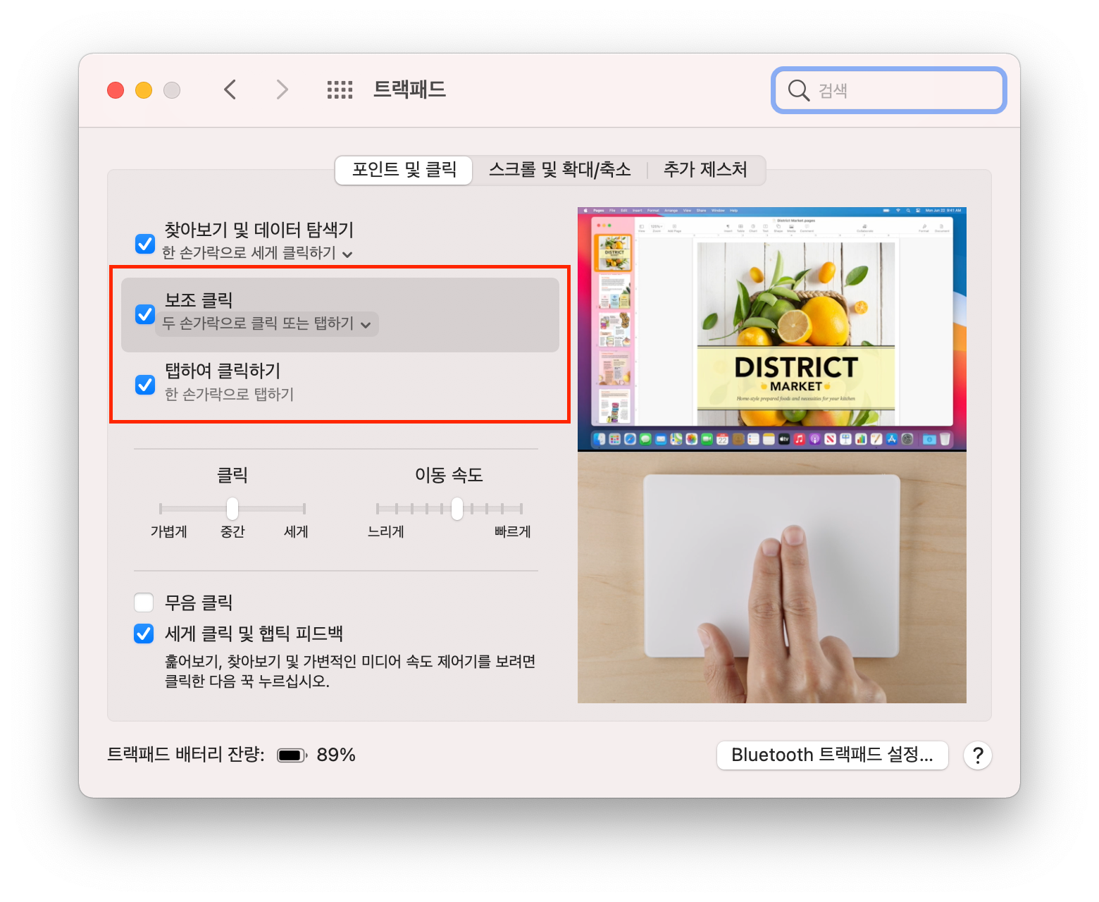 가장 기본 항목인 <보조 클릭>과 <탭하여 클릭하기>에 모두 체크를 해준다. 그러면 두 손가락으로 트랙패드에 탭을 하면 마우스 오른쪽 클릭을 한 효과와 같은 기능을 실행할 수 있다.