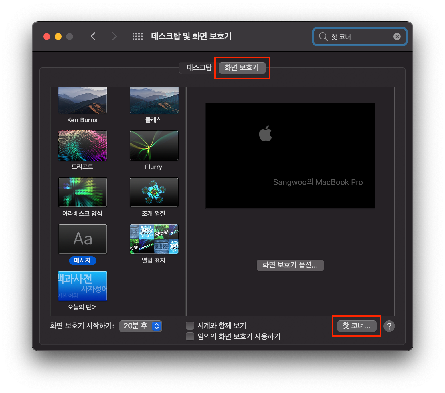 그러면 <데스크탑 및 화면 보호기>메뉴가 열리는데 위에 있는 <화면 보호기>탭을 선택해준다. 그 후 오른쪽 아래를 보면 <핫 코너> 설정을 할 수 있는 버튼을 찾을 수 있다.
