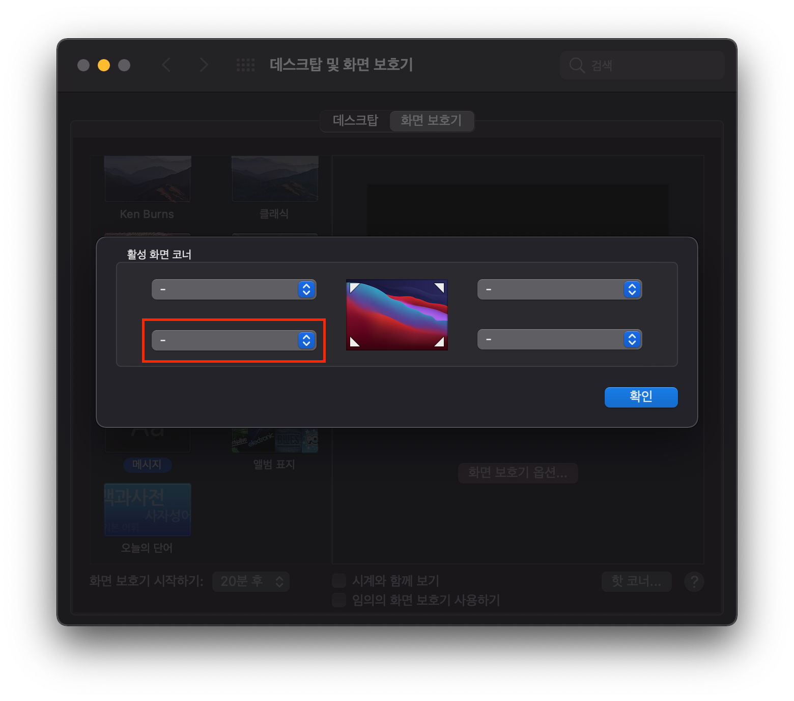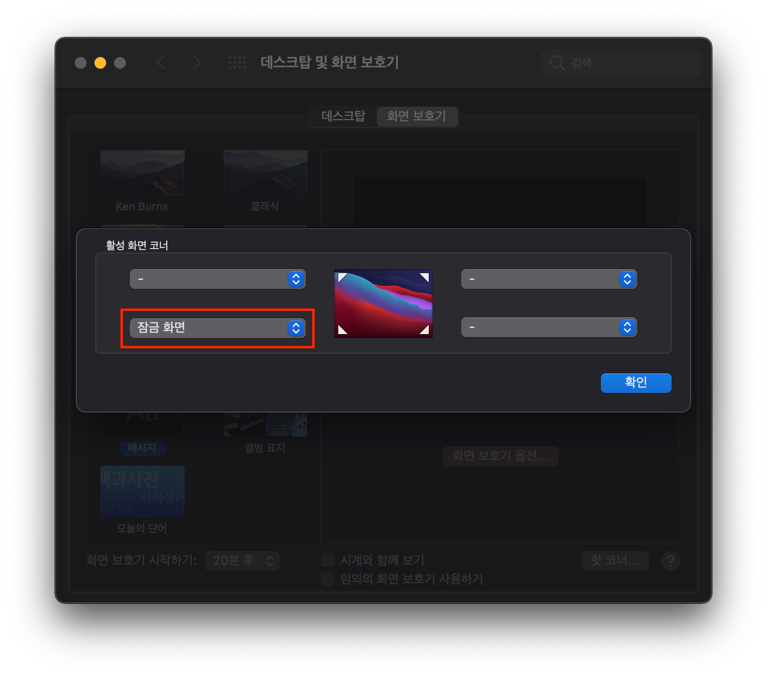 <잠금 화면> 기능을 왼쪽 아래 핫 코너에 설정한 뒤 확인을 누른다. 왼쪽 아래 구석으로 마우스를 보내면 맥이 바로 잠기는 것을 확인할 수 있다.