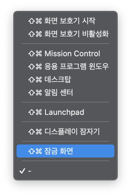 <잠금 화면> 옵션은 맥을 바로 잠금 모드로 들어가게 한다. 잠금 모드로 진입을 하면 비밀번호를 입력하거나 지문인식을 시켜야 다시 컴퓨터를 사용할 수 있다.