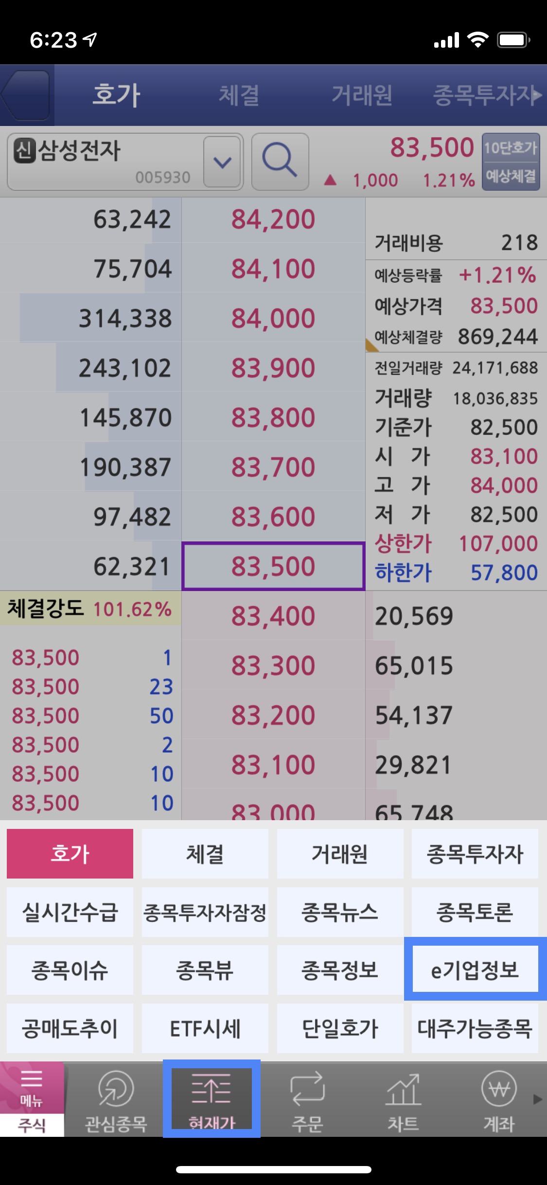 주식은 보통 현재가 탭에서 거래를 많이 하기 때문에 <현재가> 탭에 접근하는 방법은 생략하도록 하겠다. <현재가> 탭에 들어와 있는 경우 <현재가>를 한번 더 터치하면 아래 사진과 같이 접근할 수 있는 모든 메뉴가 나타난다. 거기에서 <e기업정보> 항목을 선택한다.