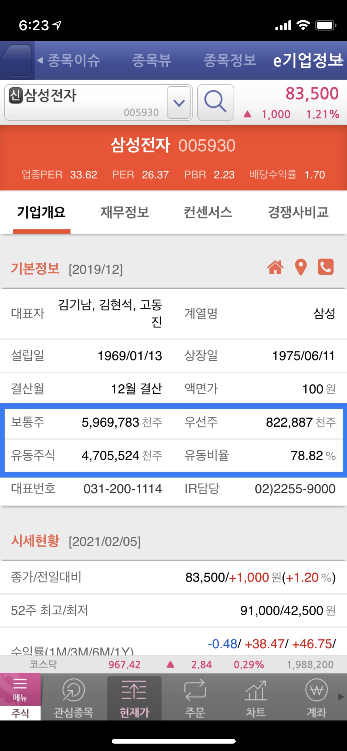 <e기업정보> 페이지로 들어가면 기업에 대한 개요가 나와있다. 거기에서 중간쯤 보면 보통주, 우선주, 유동주식 등을 확인할 수 있다. <유동주식> 항목이 실제로 시장에서 거래 가능한 주식수이다.