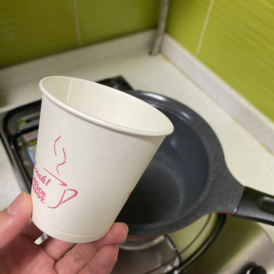 종이컵으로 물을 계량합니다. 종이컵에 물을 0.5cm정도 남긴 정도까지 채워 3컵을 냄비에 붓습니다.
