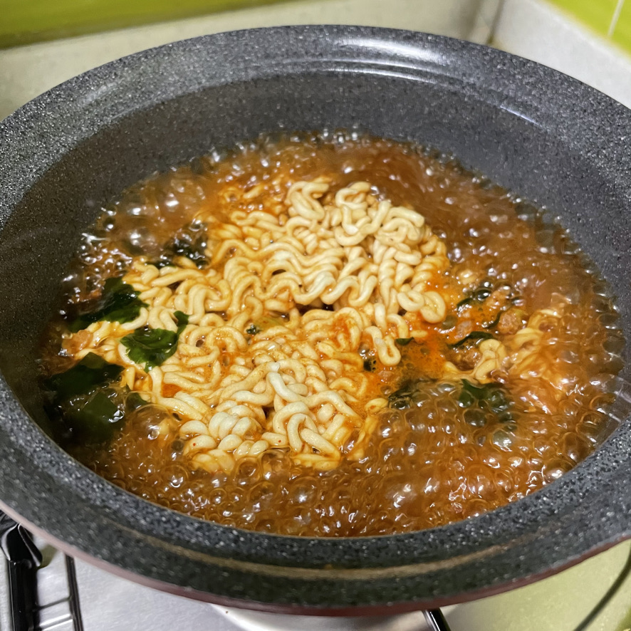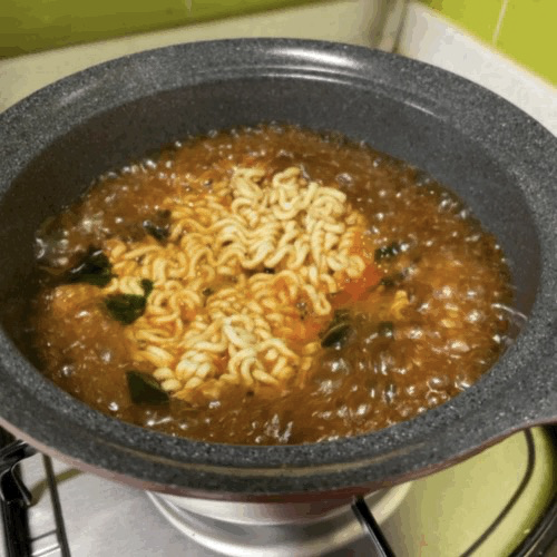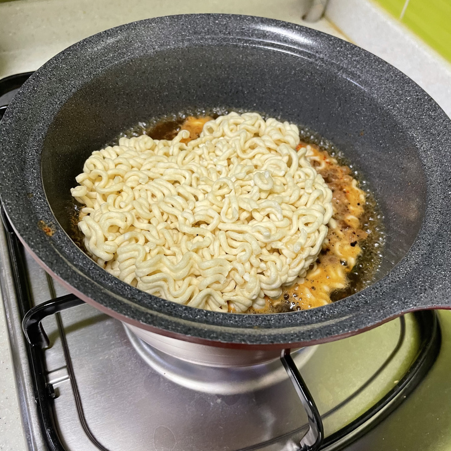 물이 끓기 시작하면 면 2개를 모두 넣어줍니다. 짜파게티와 너구리 면의 두께가 서로 다릅니다. 너구리 면이 상대적으로 늦게 익기 때문에 너구리 면이 아래에 가도록 넣어줍니다.