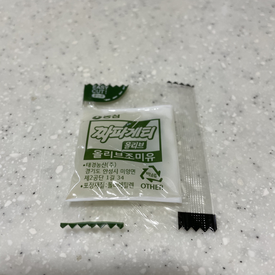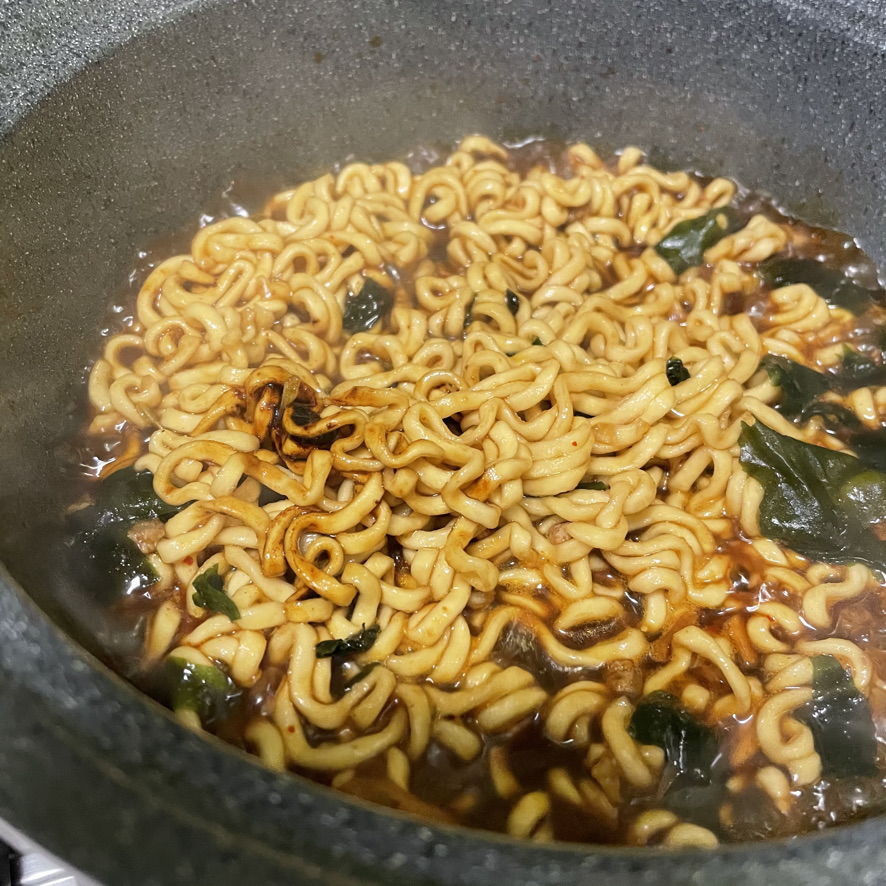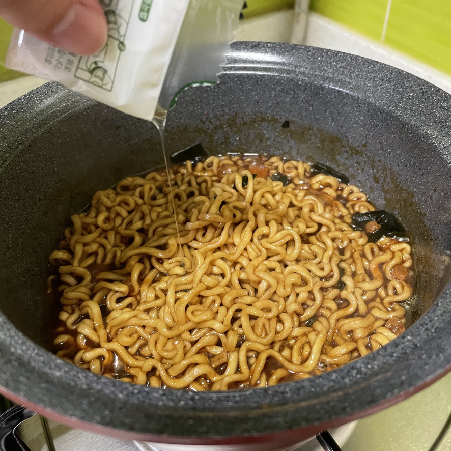 3분정도 끓이면 완성입니다. 면이 다 익었다고 판단이 되면 더 빨리 불을 끄셔도 됩니다. 불을 끈 후 짜파게티 올리브유를 넣어줍니다.