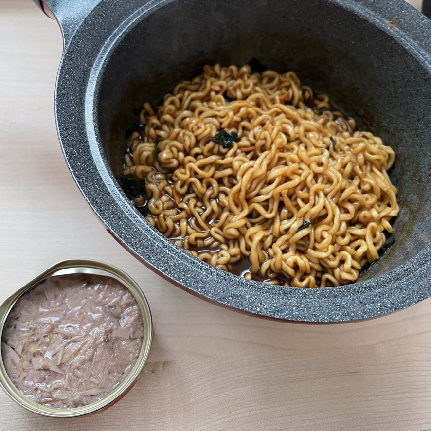 짜파구리 완성입니다. 물을 버릴 필요도 없고 간이 적절해 맛있게 먹을 수 있습니다. 참치와 함께 먹어봤는데 정말 맛있게 먹었습니다.