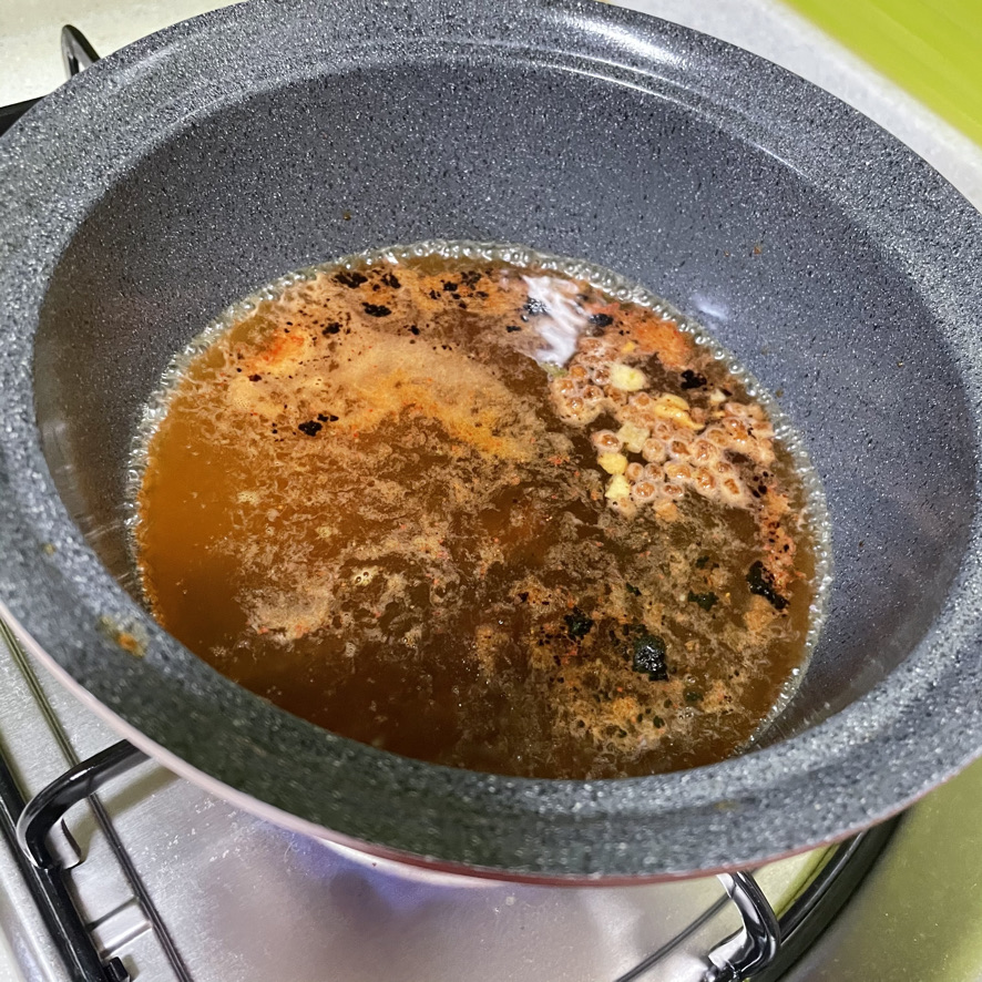 저어주다 보면 스프가 아직 풀어지지 않은 부분이 보입니다. 스프가 잘 녹도록 저어줍니다.