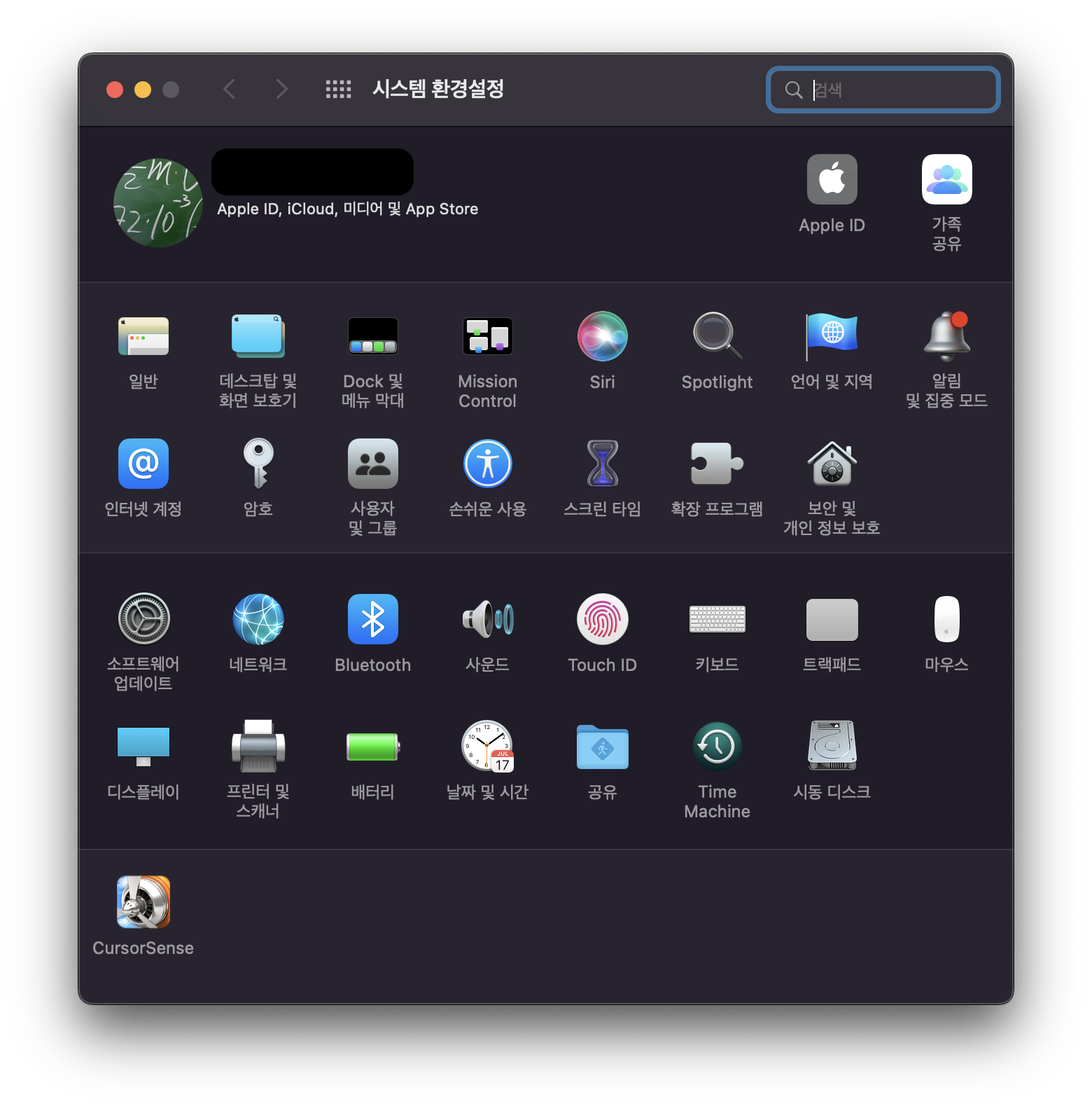 Cursorsense를 설치하면 아래의 사진과 같이 <시스템 환경설정> 내 맨 아래에 해당 프로그램이 추가된다. 여기에서 다양하게 마우스 감도를 조절할 수 있다.