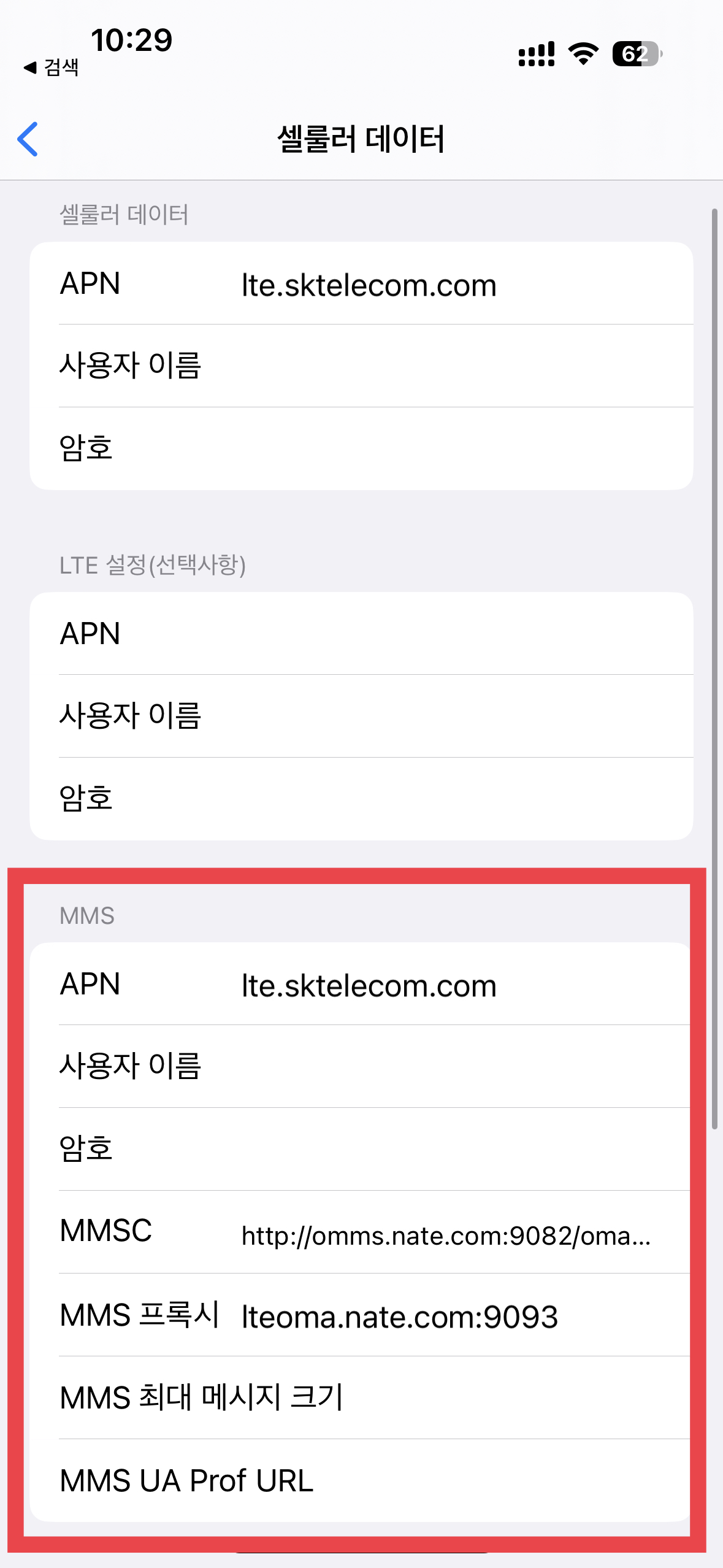 검색을 해보니 해결책이 있었고 아래와 같이 설정을 하니 MMS 수신이 정상적으로 되었다.