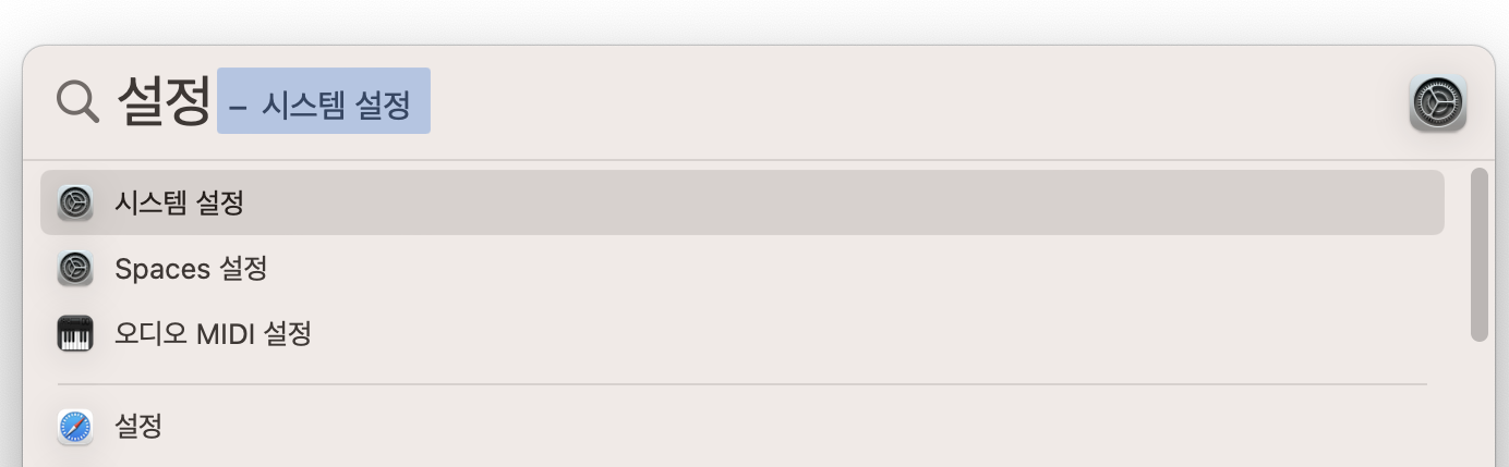 시스템 설정을 찾지 못하는 경우 맥의 스포트라이트(Spotlight) 기능으로 바로 찾을 수 있다.