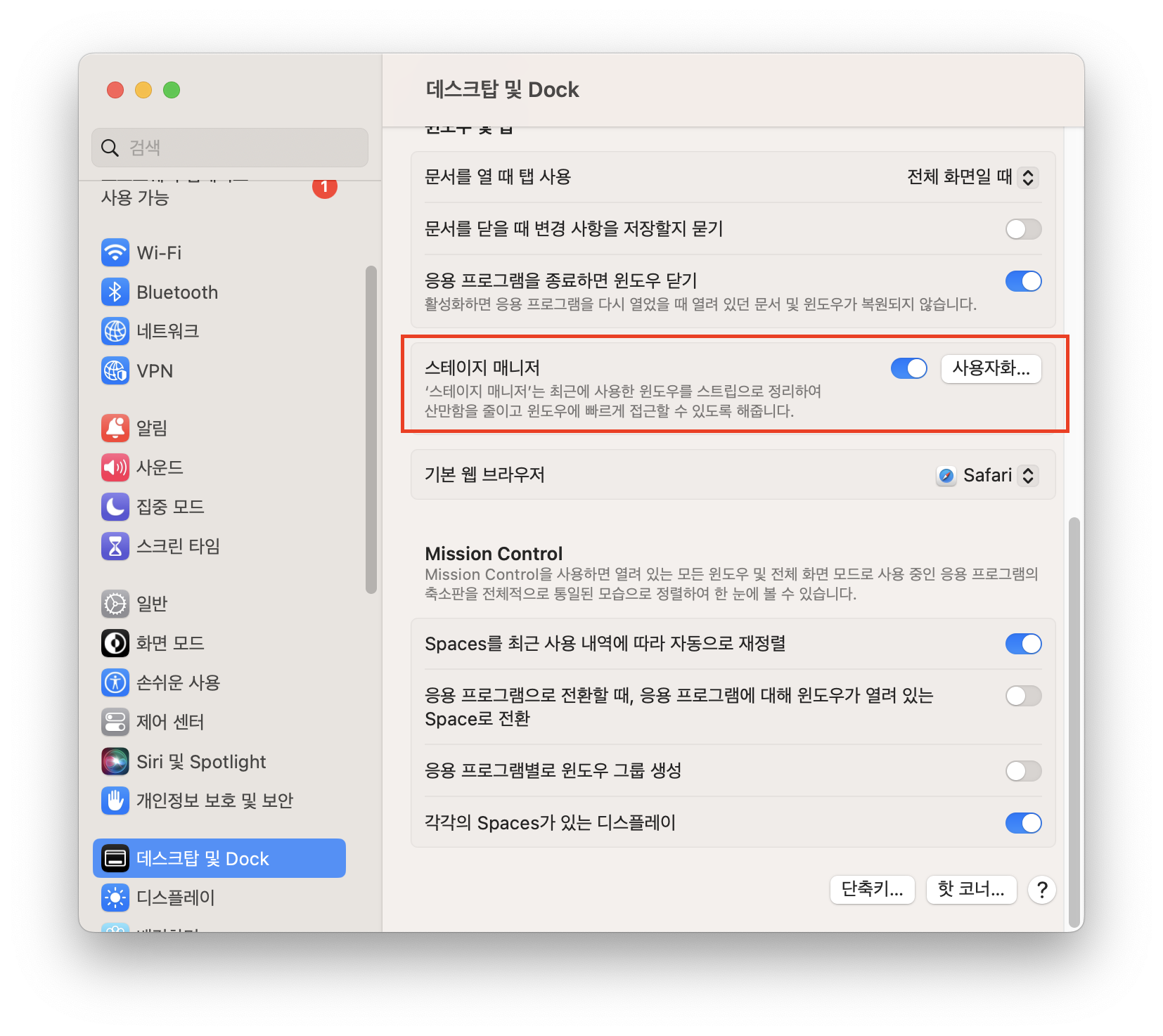 시스템 설정 -> 데스크탑 및 Dock 탭 -> 스테이지 매니저 켜기