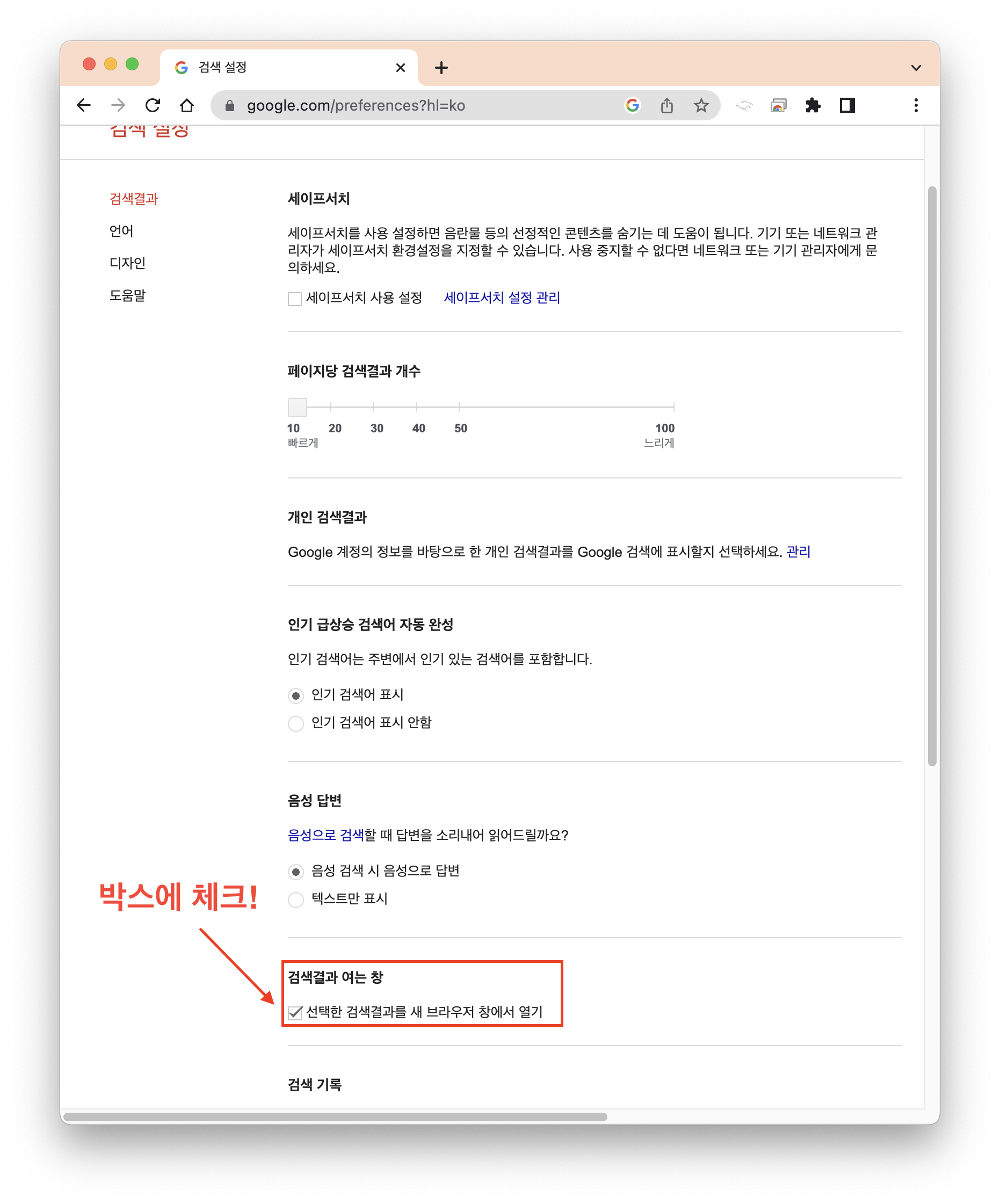 4.설정 중 <검색결과 여는 창> 항목이 있다. <선택한 검색결과를 새 브라우저 창에서 열기>의 체크박스에 체크를 해준다.