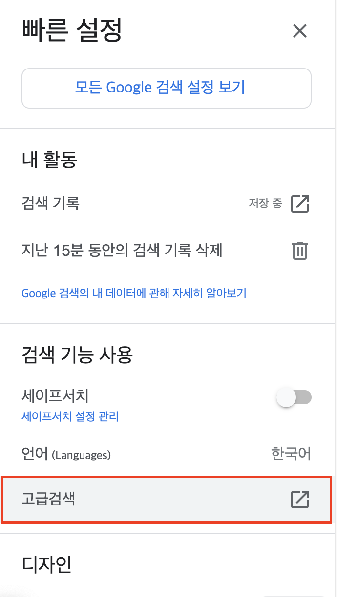 2. 오른쪽에 빠른 설정 메뉴가 나타난다. 그 중 <고급 검색> 버튼을 클릭한다.