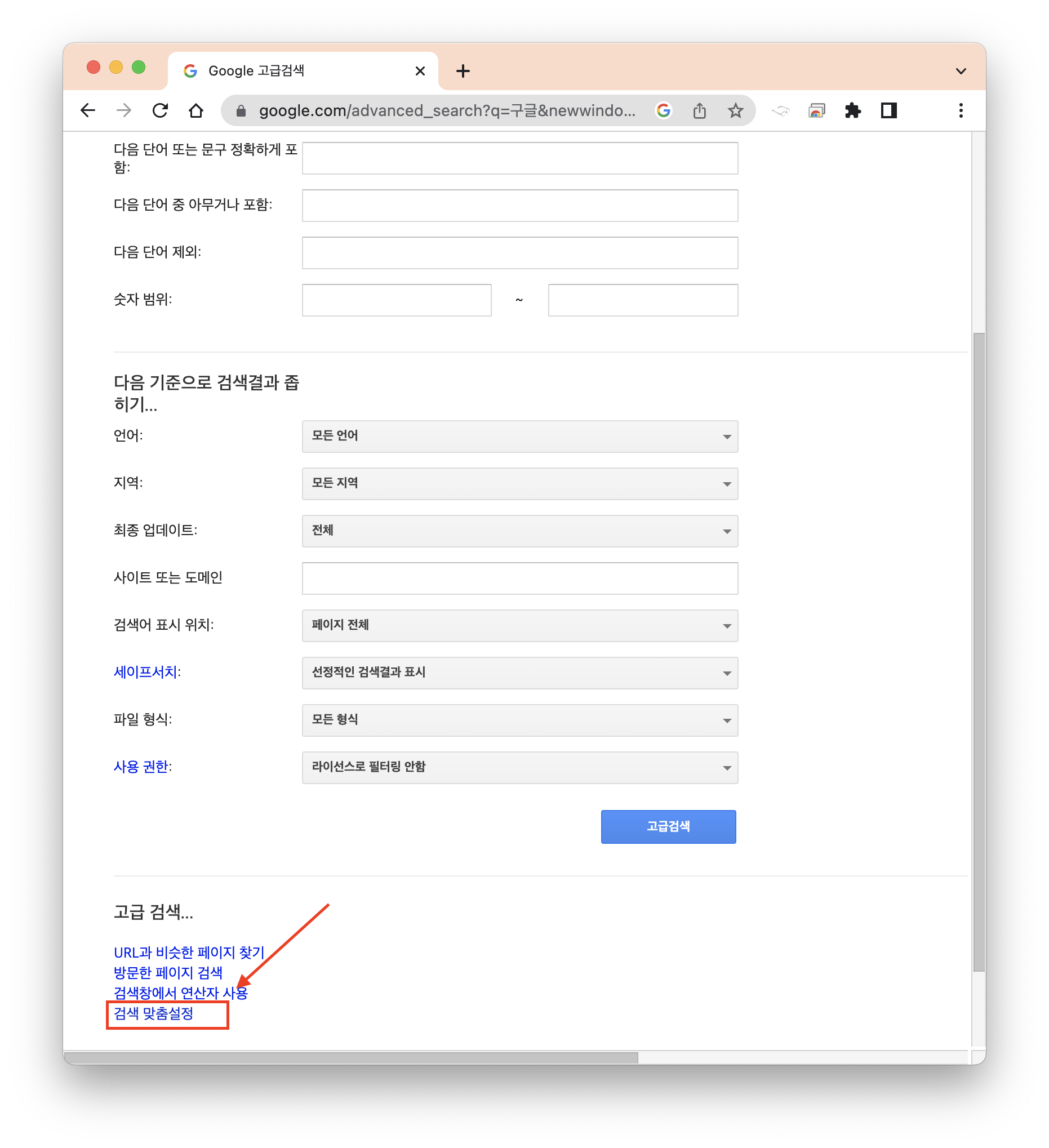 3. 아래쪽으로 스크롤 해보면 <검색 맞춤설정> 버튼이 있다. 클릭한다.