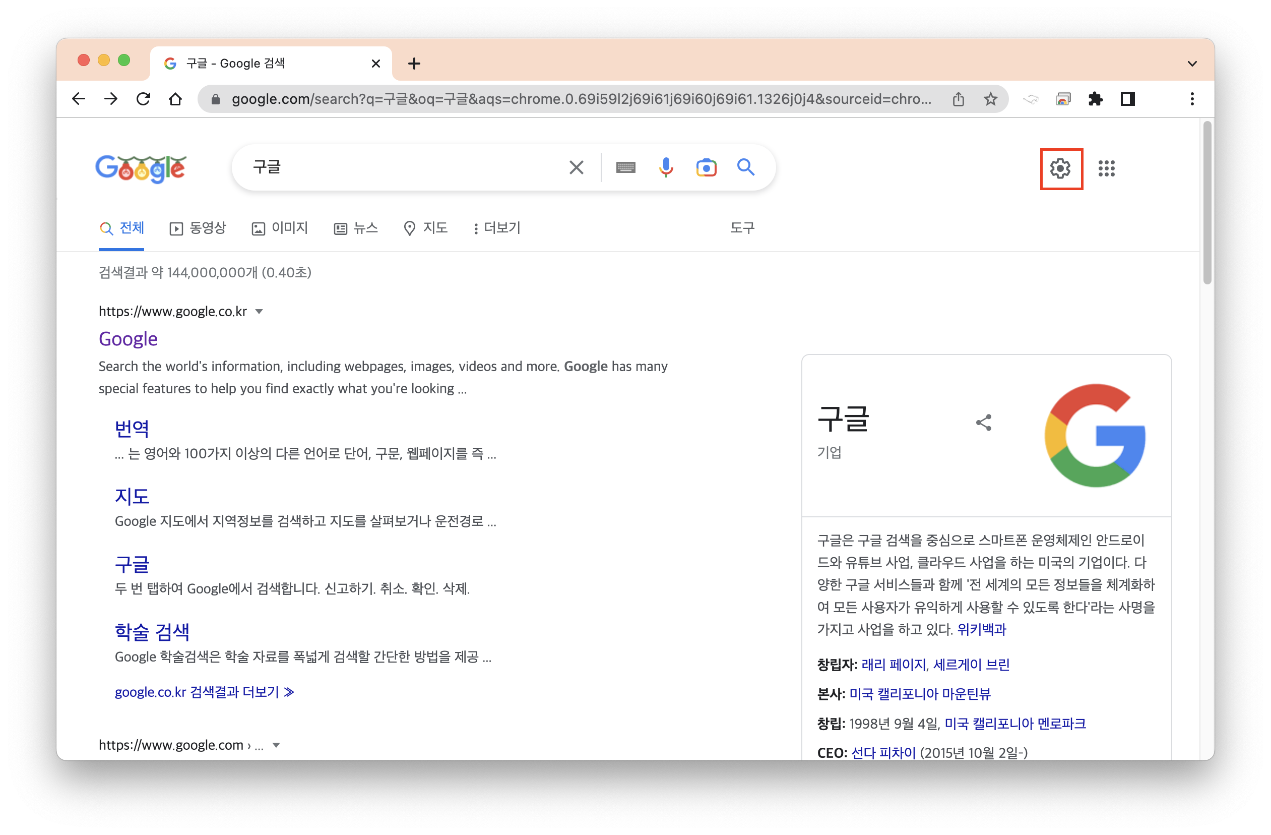 1. 구글에서 아무 내용이나 검색을 한다. 우측 상단의 <톱니바퀴 모양> 버튼을 클릭한다.